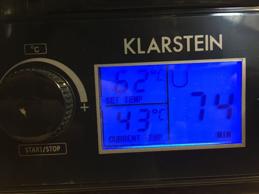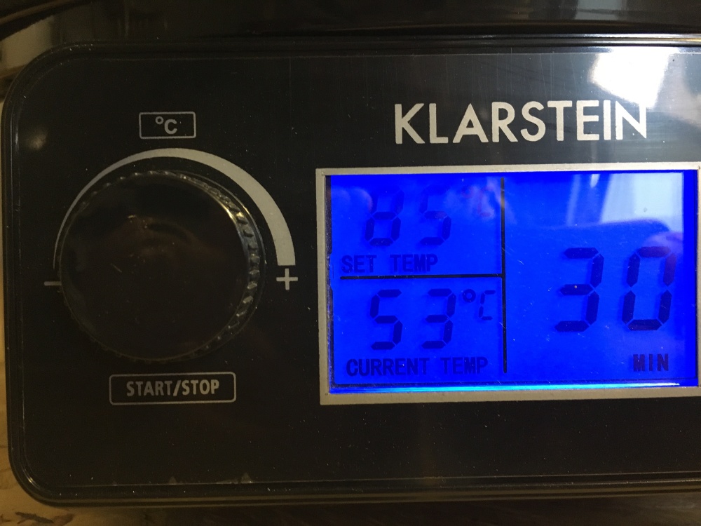 Die Wahl fiel auf einen Klarstein Biggi digital mit Rührwerk von Sascha. Malzmühle, Hobbock mit Läuterhexe und ein billiger Einkocher für den Nachguss mit 1.800 Watt waren schon da, ebenso zufällig ein 1.500 Watt Tauchsieder, der woanders gerade übrig war.