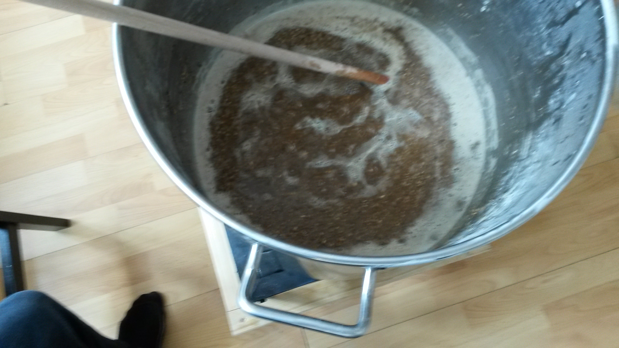 Das war für mich das größte Fragezeichen. Die Dickmaische war dermaßen zähflüssig, dass an Kochen nicht zu denken war. Braten wäre wahrscheinlicher gewesen... Dehalb Zugabe von >2Litern Wasser.