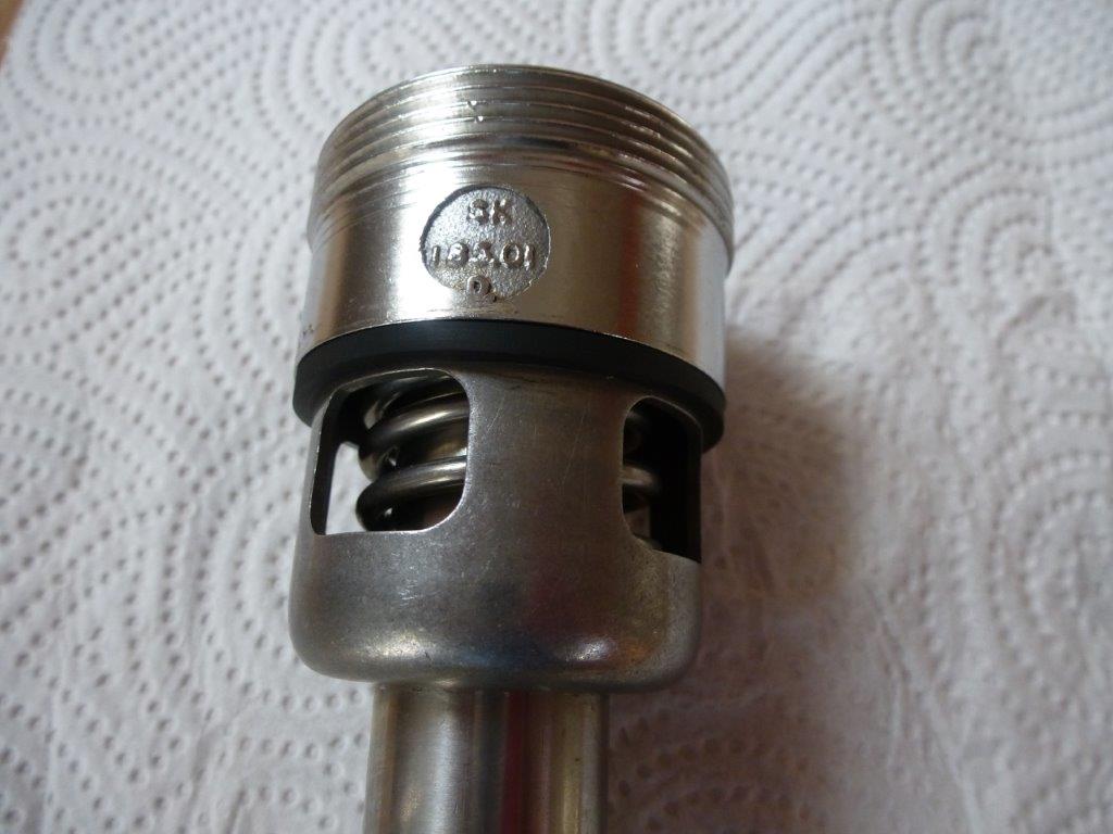 Aber die Bilder passen auch nicht so richtig. Also habe ich mal mutig meinen Öffner in den Schraubstock gespannt, den Fitting draufgesteckt und mit einer Wasserpumpenzange am Korb gegen Uhrzeigersinn gedreht, und siehe da, der Korb hat sich vom Gewindeteil gelöst.
