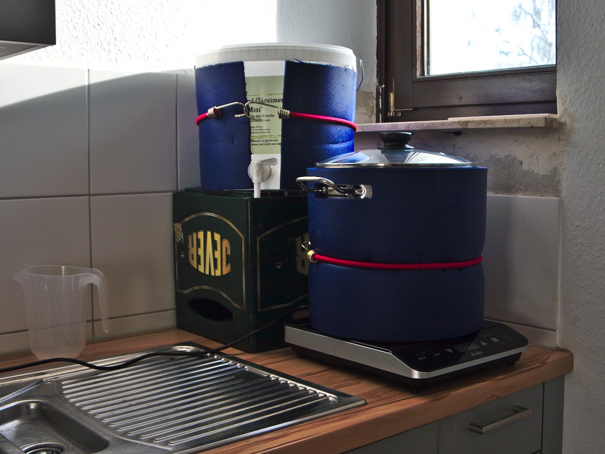 Die Basis meiner "Brauanlage" bilden eine 2000W Induktionsplatte von Aldi, ein 17l Edelstahltopf, ein 17l Braueimer zum Läutern und Gären von HuM mit Strainbuddy [1] von Amihopfen. Damit die Temperatur besser gehalten wird, hab ich eine Isomatte zurechtgeschnitten, die jeweils mit einem einfachem Spanngurt festgehalten wird. Alles zusammen lässt sich ziemlich kompakt neben der Spüle auf der Küchenarbeitsplatte aufbauen. Praktischer Weise hab ich direkt über dem Topf ein Fenster zum Lüften. Der Läutereimer steht erhöht auf einem Bierkasten.