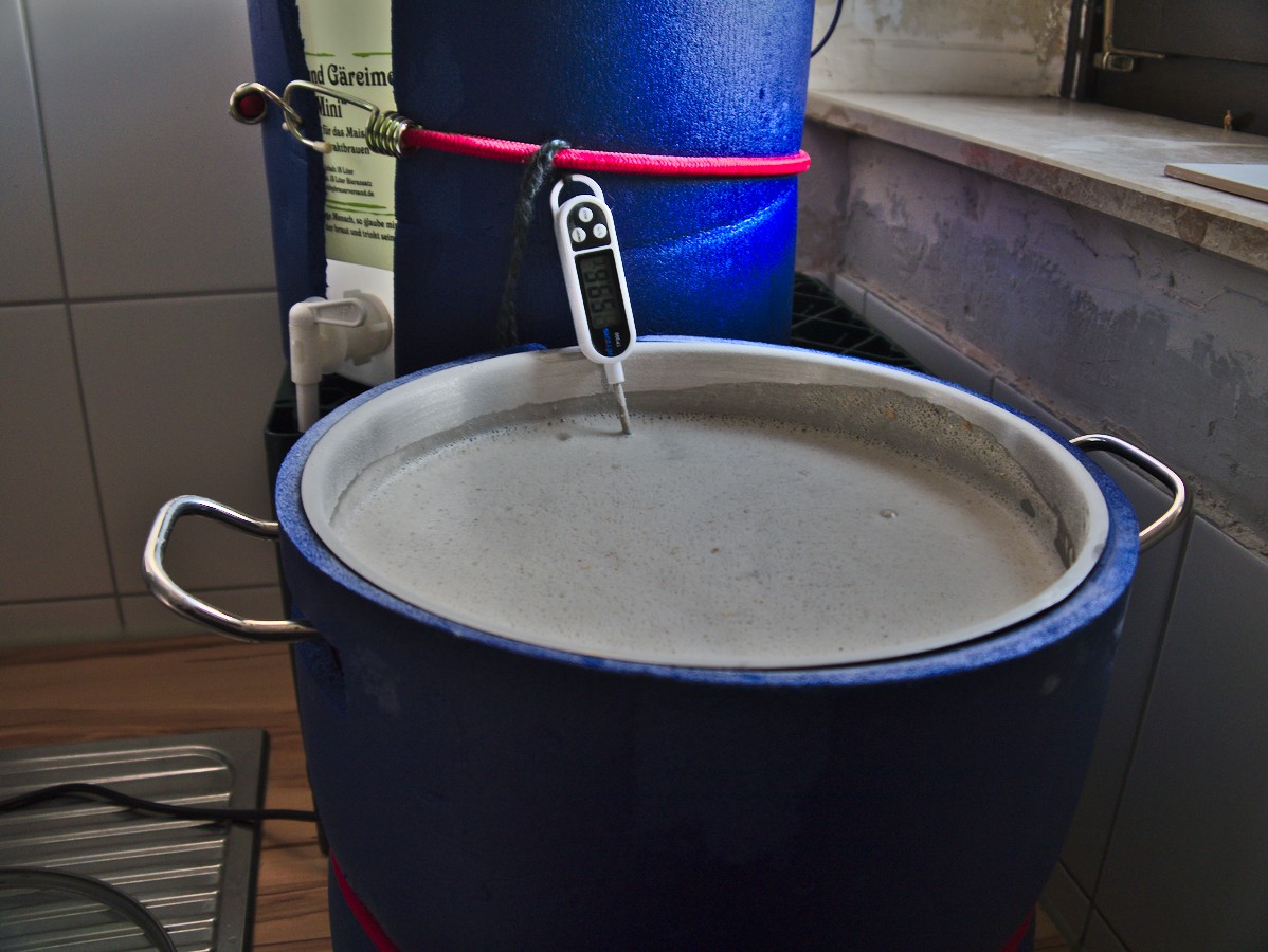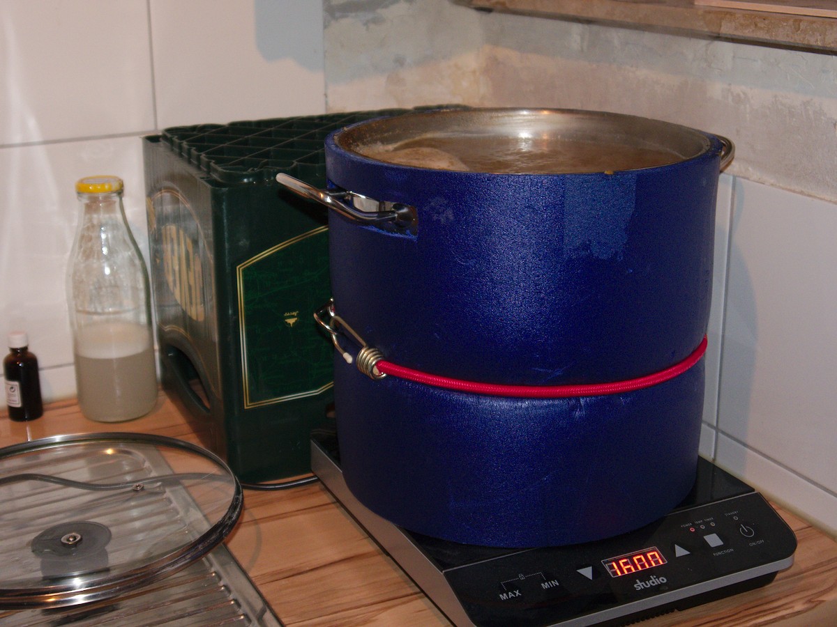 Das Maischen läuft mit der Induktionsplatte und dem isoliertem Topf ziemlich einfach und entspannt. Während den Rasten kommt der Deckel auf den Topf. Bei der Maltoserast hab ich die Temperatur einmal nachkorrigiert, ansonsten lasse ich die Maische einfach ruhen und verliere dabei ca 1°. Das Thermometer [2] hab ich für ca. 2€ aus China und reagiert für meinen Geschmack etwas zu Träge auf Temperaturänderungen - bei dem Preis ist das aber Meckern auf sehr hohem Niveau.