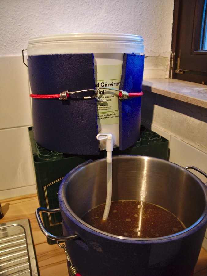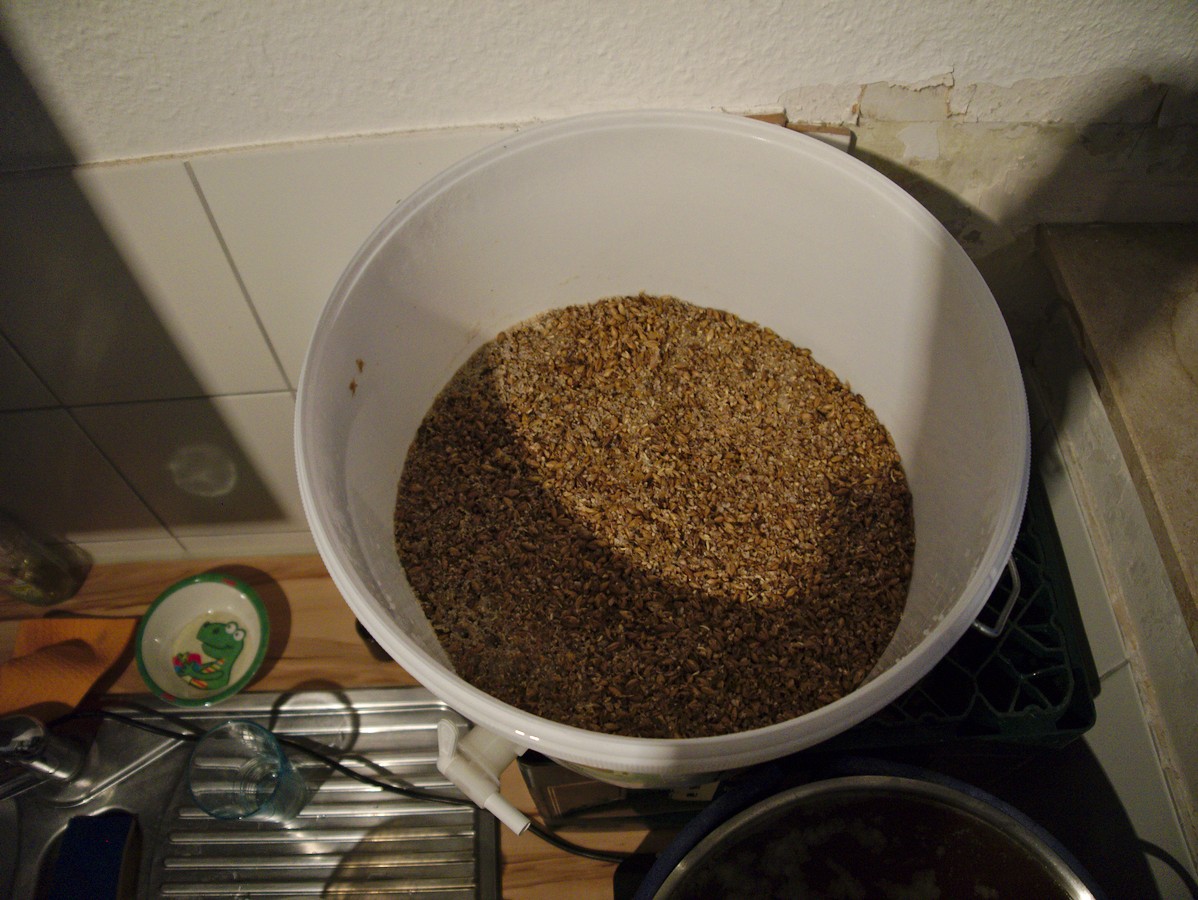 Wirklich zufrieden bin ich mit dem Läutervorgang nicht. Es geht 1. gefühlt nur sehr langsam voran (hab leider vergessen die Zeit zu nehmen), 2. muss ich den Eimer gegen Ende schräg stellen und es verbleibt trotzdem sehr viel Flüssigkeit im Treber. 8l Nachguss waren veranschlagt um auf 16.5l vor Kochbeginn zu kommen, benötigt hab ich im Endeffekt 10l. Auch bei den ersten beiden Suden hab ich mehr gebraucht als vom Mügelland-Rechner berechnet. Außerdem lässt die Ausbeute zu wünschen übrig - dazu weiter unten mehr.