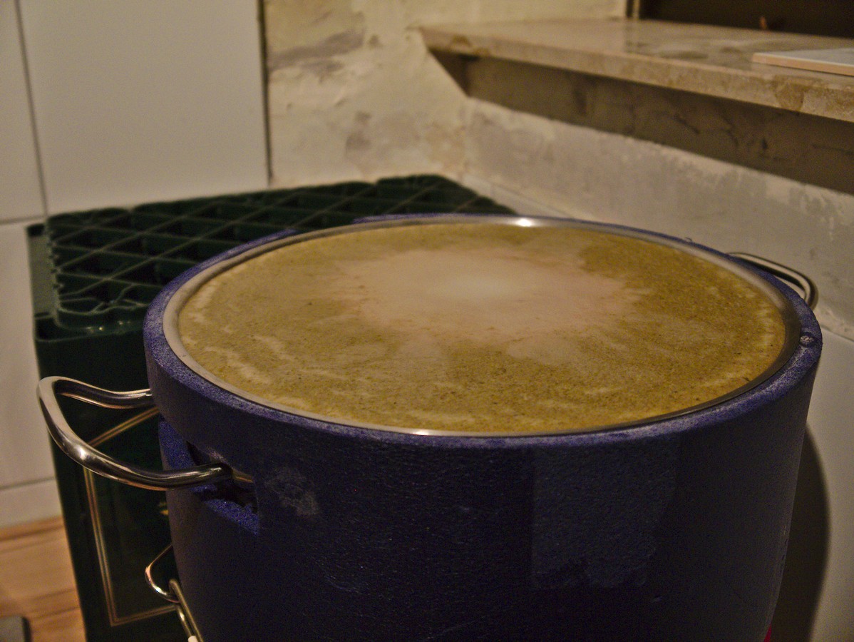 Die Würze ist über Nacht abgekühlt und wurde am Montag um 14 Uhr mit der Hefe angestellt. Jetzt warte ich warte darauf, dass die Hefe ankommt.