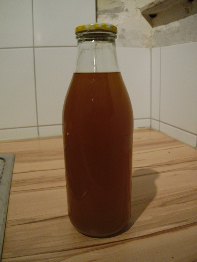 Hier hab ich definitiv noch Optimierungsbedarf! Am Ende landen dennoch 11.5l im Braueimer und 1l in einer gereinigten Milchflasche als Speise mit 16.5° Plato - 1.5l weniger als veranschlagt mit einer Ausbeute von nur 60%. Auch wenn im Forum viel darüber gelästert wird bin ich der Meinung, dass das Aufspeisen mit Würze vor dem Abfüllen relativ stressfrei funktioniert. Heiß abgefüllt ist die Speise in der gereinigten Milchflasche praktisch steril und den EVG, den ich für die Speisemenge brauche, berechne ich vor dem Abfüllen sowieso.
