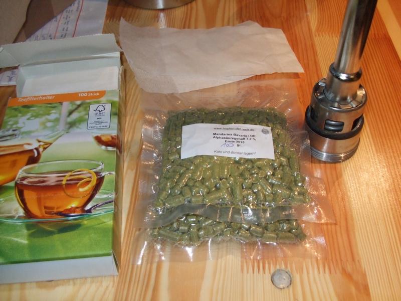 Als ersten Versuch habe ich ein 25 Liter KEG hergenommen und habe mir von Alexander 100 g Mandarina besorgt.