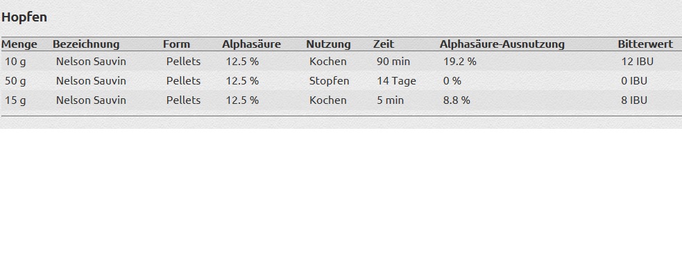 Die Reihenfolge stimmt nicht. Würze kochen, erste Hopfengabe (10g) rein, 5 Minuten vor Schluss die zweite (15g) und nach der Hauptgärung stopfen (50g)