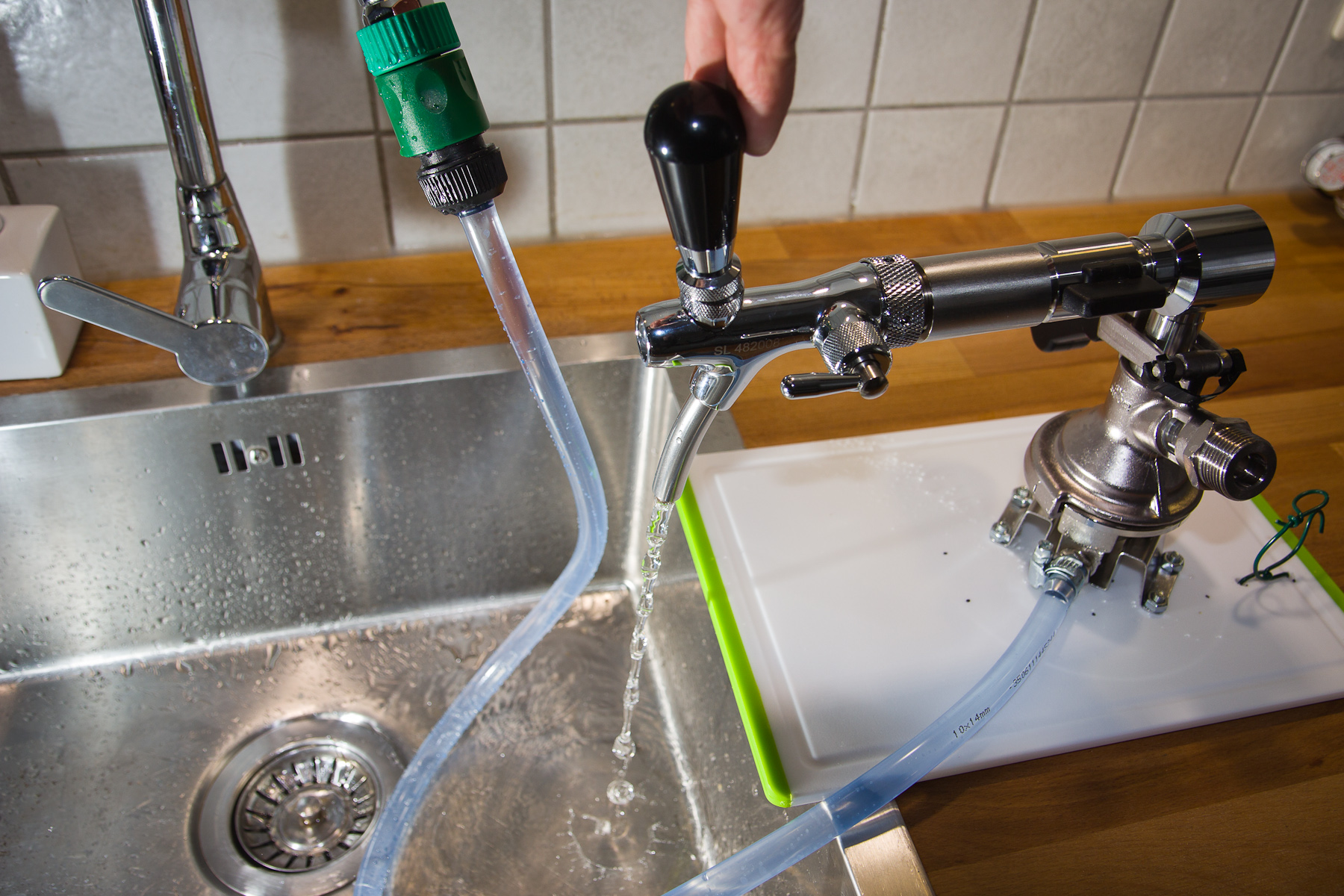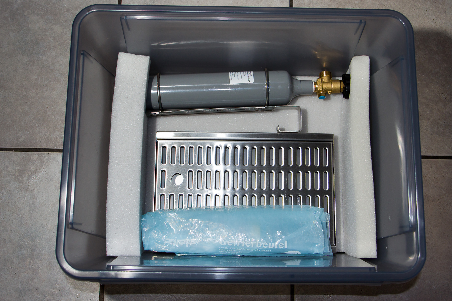 Ausgangsbasis ist eine wasserdichte Box aus dem Baumarkt. Den Boden habe ich mit 30mm Schaumstoff bedeckt. Die Schaumstoffware musste ich noch in der Breite zuschneiden. Die Reste habe ich seitlich geklemmt. Somit ist die CO2-Flasche und die Tropfschale geschützt. Die Bürsten, Ersatzdichtungen, Schankhahnfett, etc. sind im Gefrierbeutel eingerollt und liegen auf der Tropfschale. Die nächste Ebene bildet eine 9mm Siebdruckplatte aus Birke mit 50mm Schaumstoff. In den Schaumstoff habe ich verschiedene Ausschnitte für das Equipment mit einem Cuttermesser geschnitten. Ich kann dann auch beim Zusammenpacken schnell sehen, ob ich alles dabei habe. Wer sich über den Messinghahn wundert: Der ist als Backup dabei, falls das CO2 leer ist... Obenauf lege ich meinen selbstgebauten Reinigungsadapter für das Zapfset und sonstige Kleinteile, wie z.B. die Rohrzange, etc. Deckel drauf und ab zur nächsten Party. Ich habe die Kiste jetzt schon ca. 1000 km im Auto herumgefahren. Da verrutscht nichts, alles bleibt an Ort und Stelle. So wie es sein soll. Nun zur Reinigung: Vor und nach dem Zapfen spüle ich das Zapfset mit lauwarmen Wasser durch. Das klappt schnell und easy. Das schaffe ich auch, wenn ich schon müde werde...