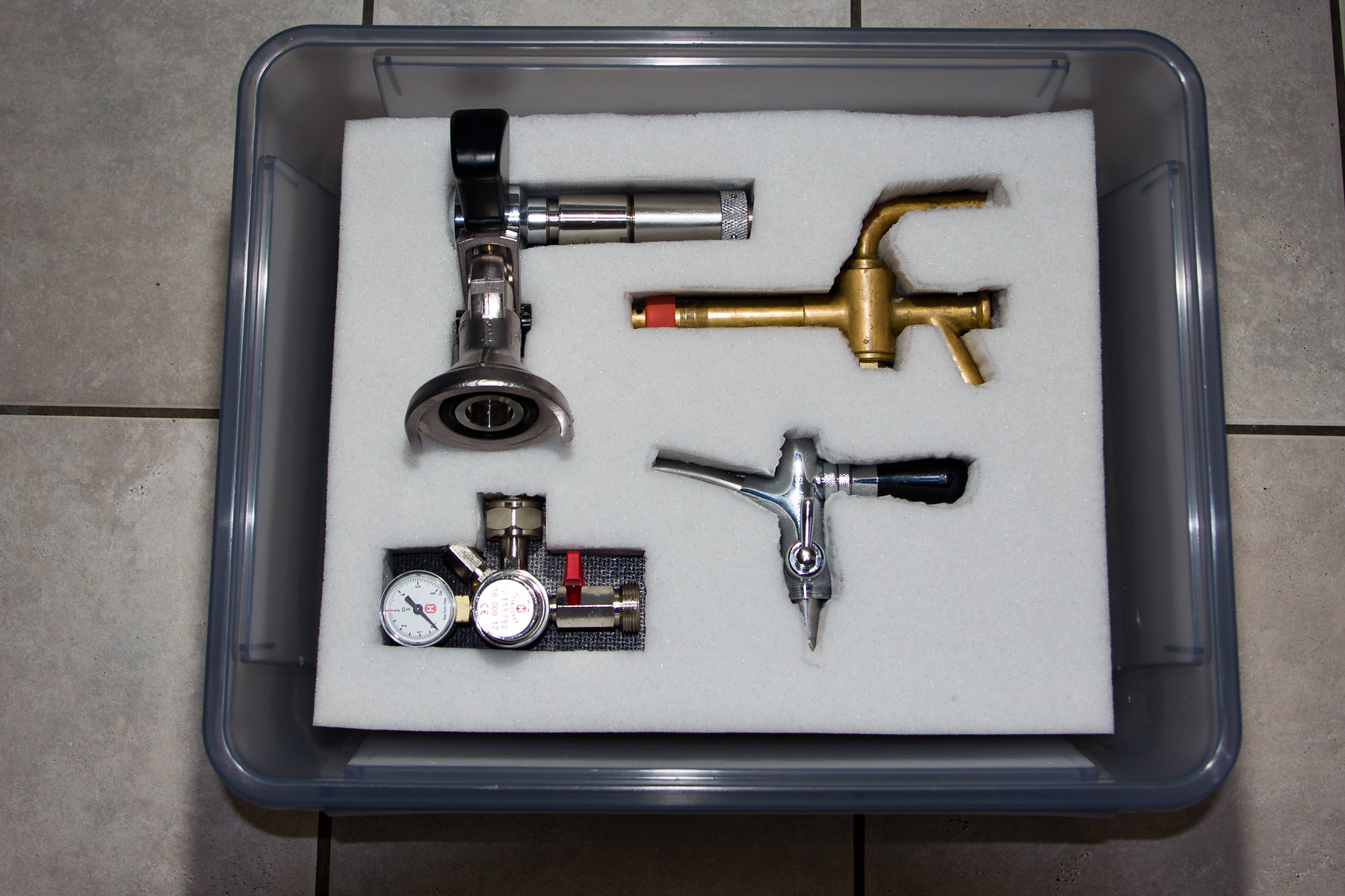 Ausgangsbasis ist eine wasserdichte Box aus dem Baumarkt. Den Boden habe ich mit 30mm Schaumstoff bedeckt. Die Schaumstoffware musste ich noch in der Breite zuschneiden. Die Reste habe ich seitlich geklemmt. Somit ist die CO2-Flasche und die Tropfschale geschützt. Die Bürsten, Ersatzdichtungen, Schankhahnfett, etc. sind im Gefrierbeutel eingerollt und liegen auf der Tropfschale. Die nächste Ebene bildet eine 9mm Siebdruckplatte aus Birke mit 50mm Schaumstoff. In den Schaumstoff habe ich verschiedene Ausschnitte für das Equipment mit einem Cuttermesser geschnitten. Ich kann dann auch beim Zusammenpacken schnell sehen, ob ich alles dabei habe. Wer sich über den Messinghahn wundert: Der ist als Backup dabei, falls das CO2 leer ist... Obenauf lege ich meinen selbstgebauten Reinigungsadapter für das Zapfset und sonstige Kleinteile, wie z.B. die Rohrzange, etc. Deckel drauf und ab zur nächsten Party. Ich habe die Kiste jetzt schon ca. 1000 km im Auto herumgefahren. Da verrutscht nichts, alles bleibt an Ort und Stelle. So wie es sein soll. Nun zur Reinigung: Vor und nach dem Zapfen spüle ich das Zapfset mit lauwarmen Wasser durch. Das klappt schnell und easy. Das schaffe ich auch, wenn ich schon müde werde...