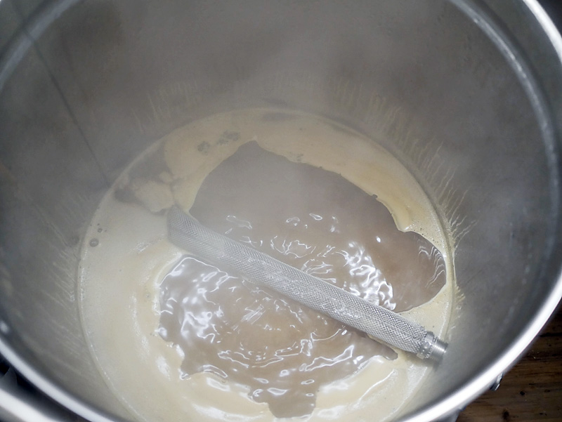 Über einen Mini-Trichter mit Silikonschlauch läuft die Vorderwürze in meinen Hoppy 30-Liter-Edelstahltopf (siehe auch viewtopic.php?f=22&t=10921&p=181215&hilit=hoppy#p181215). Der wird durch eine 2000-Watt-Induktionsplatte beheizt. Wallendes Kochen ist problemlos bei 1600 Watt möglich. Allerdings dürfte das Aufheizen doch etwas flotter gehen. Naja, 2000 Watt Tefal sind halt nicht 3500 Watt Hendi.