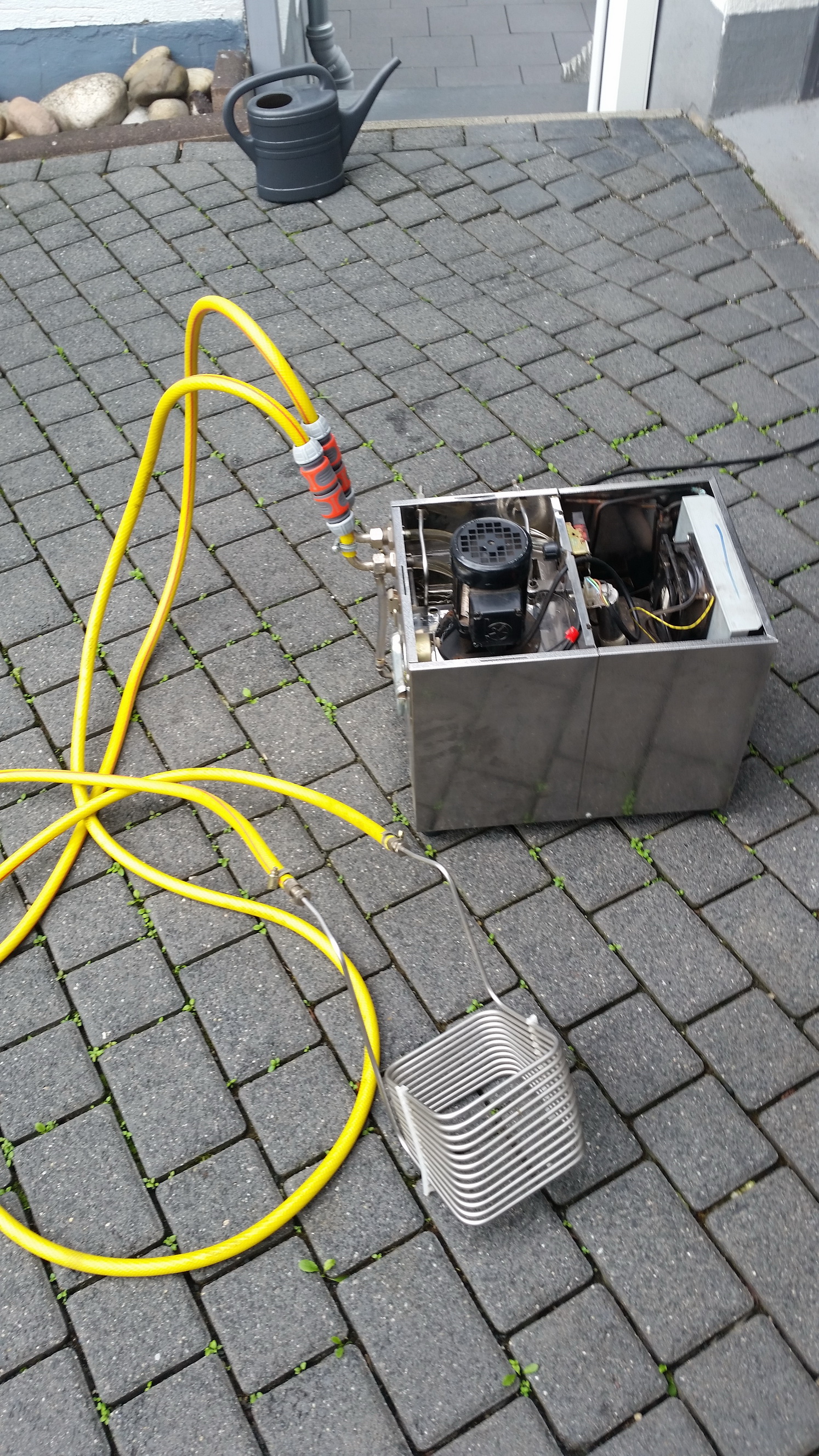 Wenn Du mein Bild zoomst wirst Du sehen, dass ich einen zweite Kühlspirale verbaut habe. Das ist meine Durchlaufkühlung. Hab mir die Kombi also aus einem 2.-Gerät umgebaut.