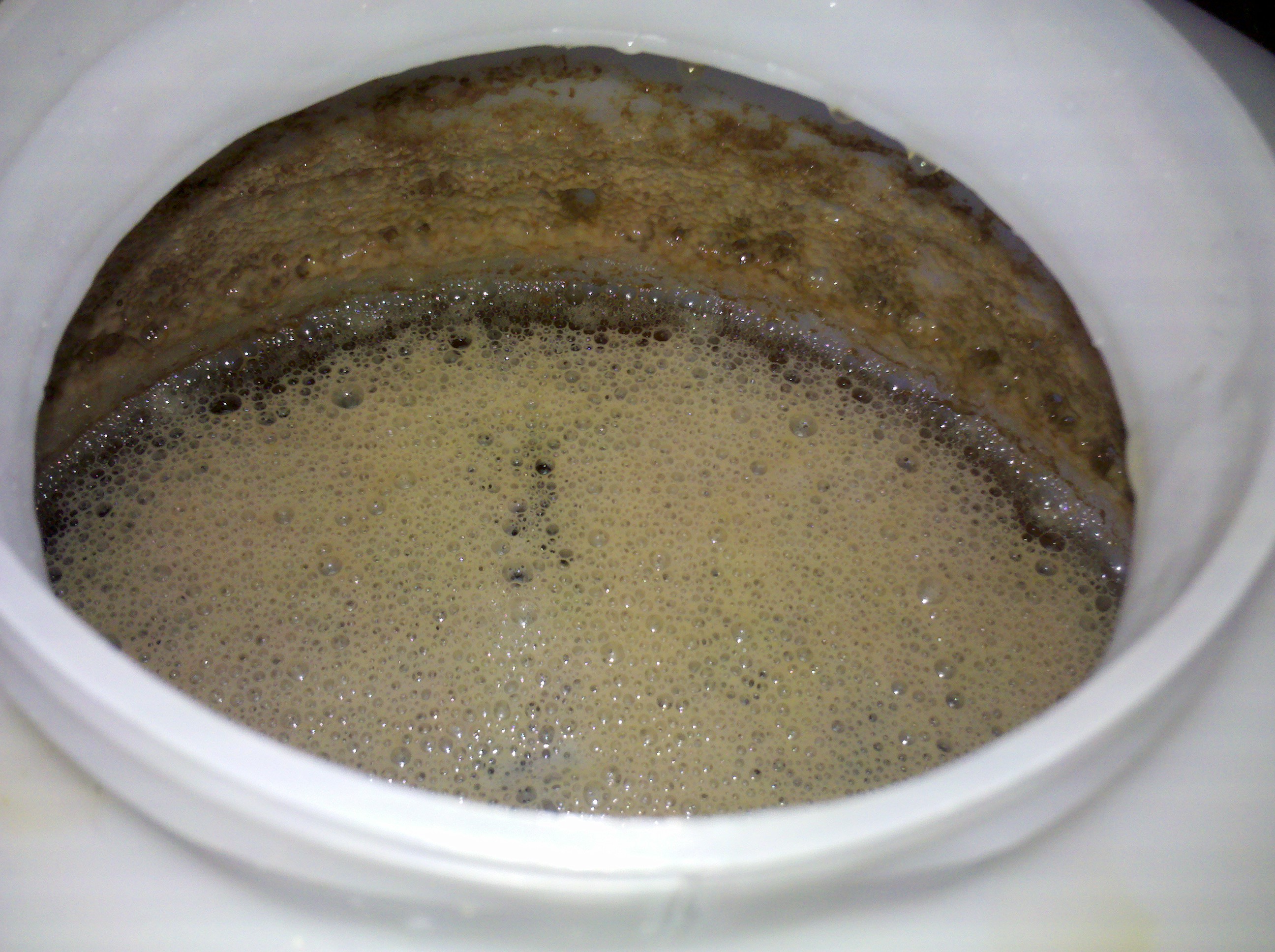 Auf jeden Fall wollte ich das wiederholen und hab letzten Samstag das Rezept (ist ein Weizenbier, 60% WeMa, 40% MüMa) leicht abgeändert nochmals gebraut. Heute wollte ich eigentlich abfüllen, hab aber festgestellt, dass im Gärbottich immer noch eine Schaumschicht vorhanden ist (siehe Bild). Der Restextrakt hat sich seit drei Tagen nicht verändert (7 Brix -> 3,1°P, Stammwürze war 13°P). Beim letzten Mal war der Schaum nach der Hauptgärung fast vollständig verschwunden.