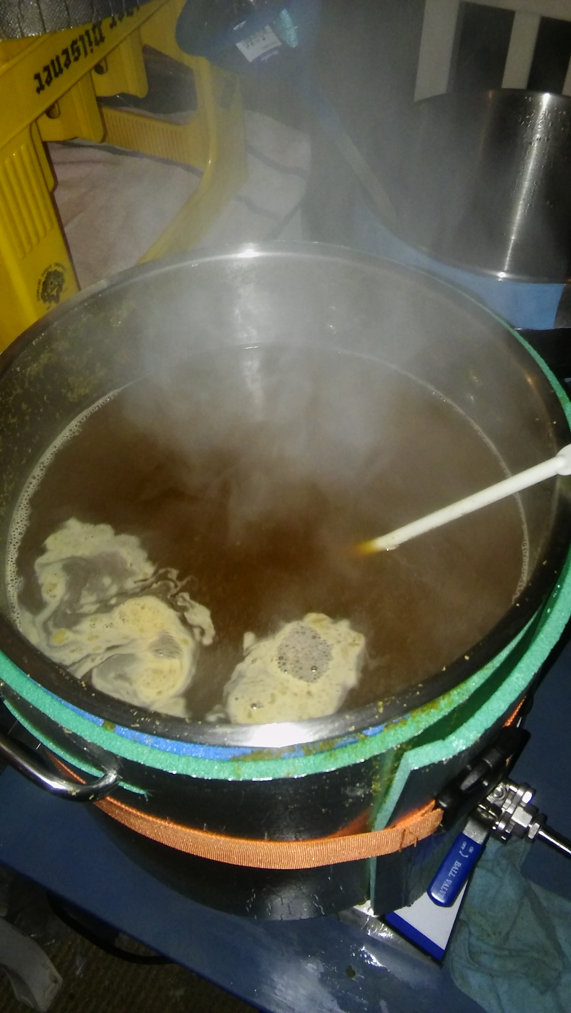 Mein Rührwerk habe ich selbst zusammengeklöppelt, es funktioniert auch, aber inzwischen hab ich den Deckel gegen einen gescheite Buchenholzplatte getauscht. Der Amihopfentopf und die Hendiplatte waren zum ersten Mal im Einsatz - eine Investition, die ich nicht bereue. Bevor es Schelte gibt: ich weiß, mein Aufbau mit der Bierkiste ist nicht unfallsicher, ich arbeite gedanklich schon an einem schönen Brautisch. Eins nach dem anderen...