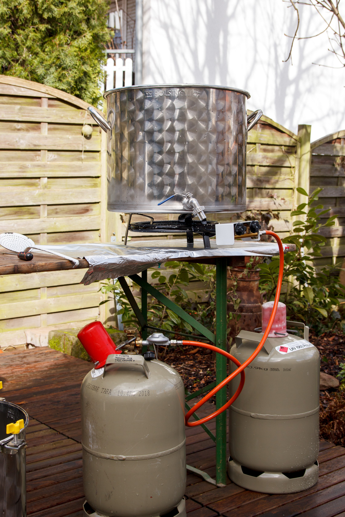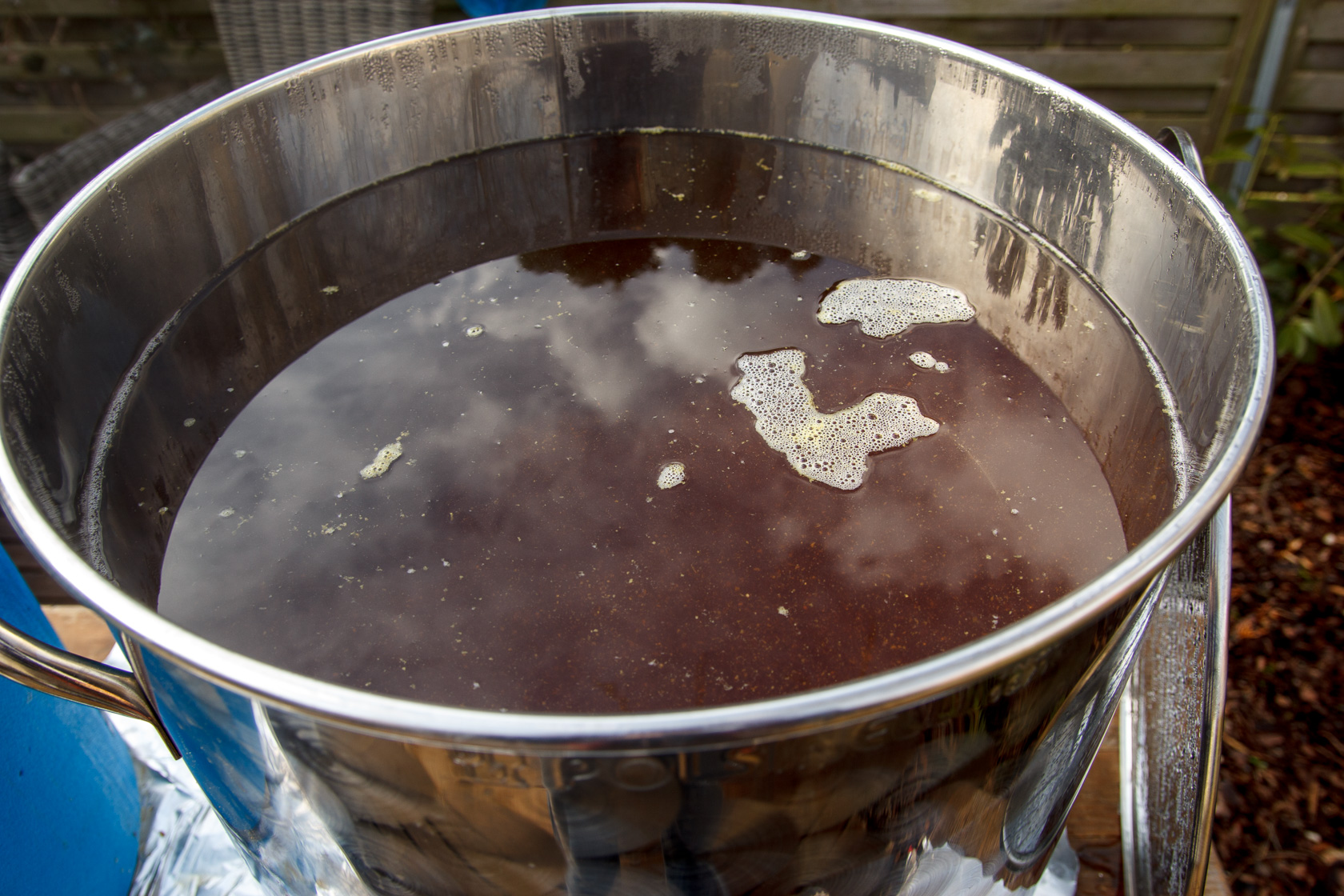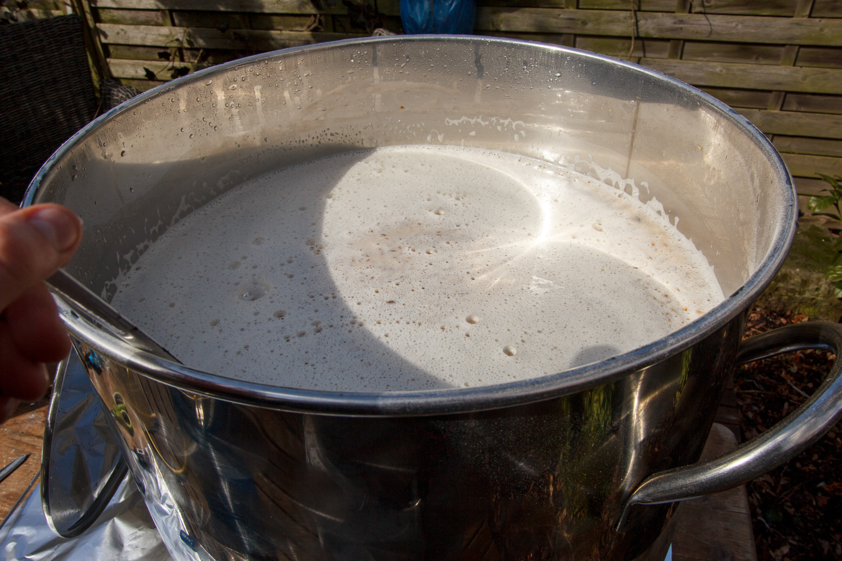 Vom Läutern sind keine Bilder entstanden, da war einfach zu viel zu tun. Auch eine knappe Nummer war ein Vogel, der im Baum über dem Kochtopf saß. Gerade als ich die letzte Hopfung geben wollte, kotete dieser keine 10 cm neben den offenen Sud :Shocked