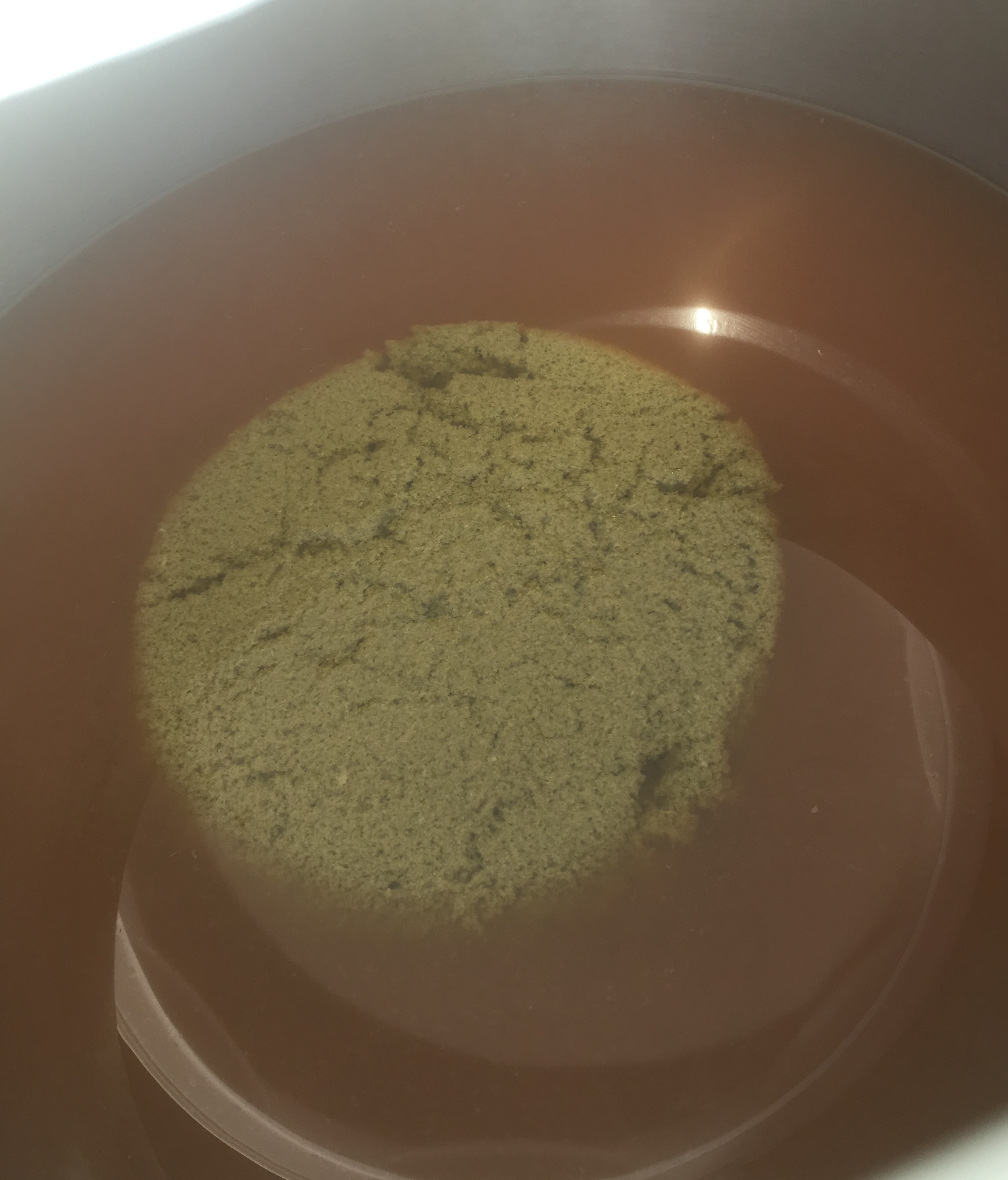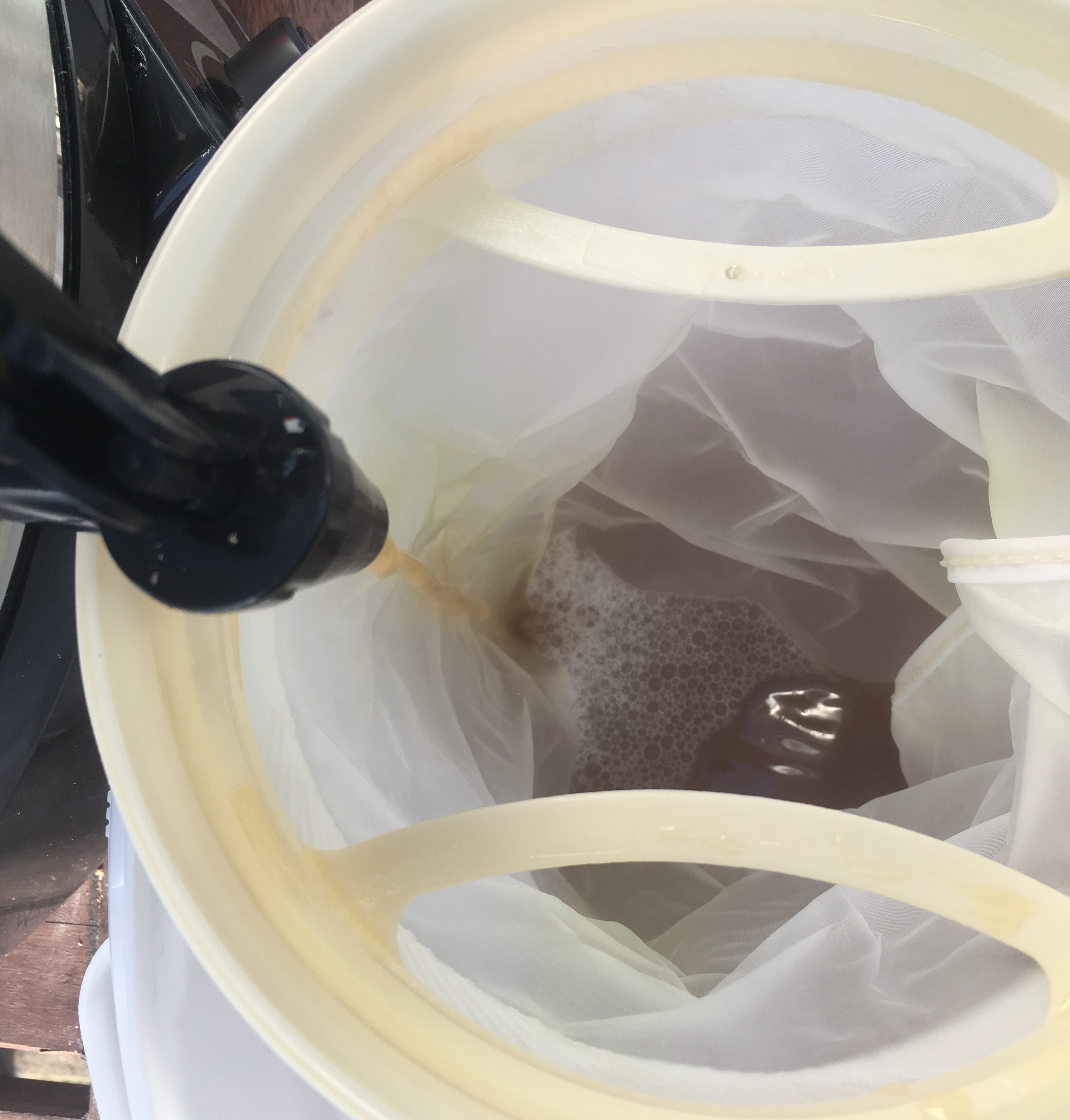 Läutern zurück in den Einkocher aus dem Läutereimer mit eingelegtem MattMill Läuterblech. Wie auf dem Bild zu sehen, hat sich das Blech sehr gut bezahlt gemacht. Ich habe auch hier nach Anleitung 14 Liter Wasser nachgegossen. Ich habe das Wasser im Einkocher erhitzt und in den zweiten vorhandenen Gäreimer (30L) umgefüllt. Dies war eine große Hilfe, da ich keine so großen Töpfe in passender Anzahl habe.