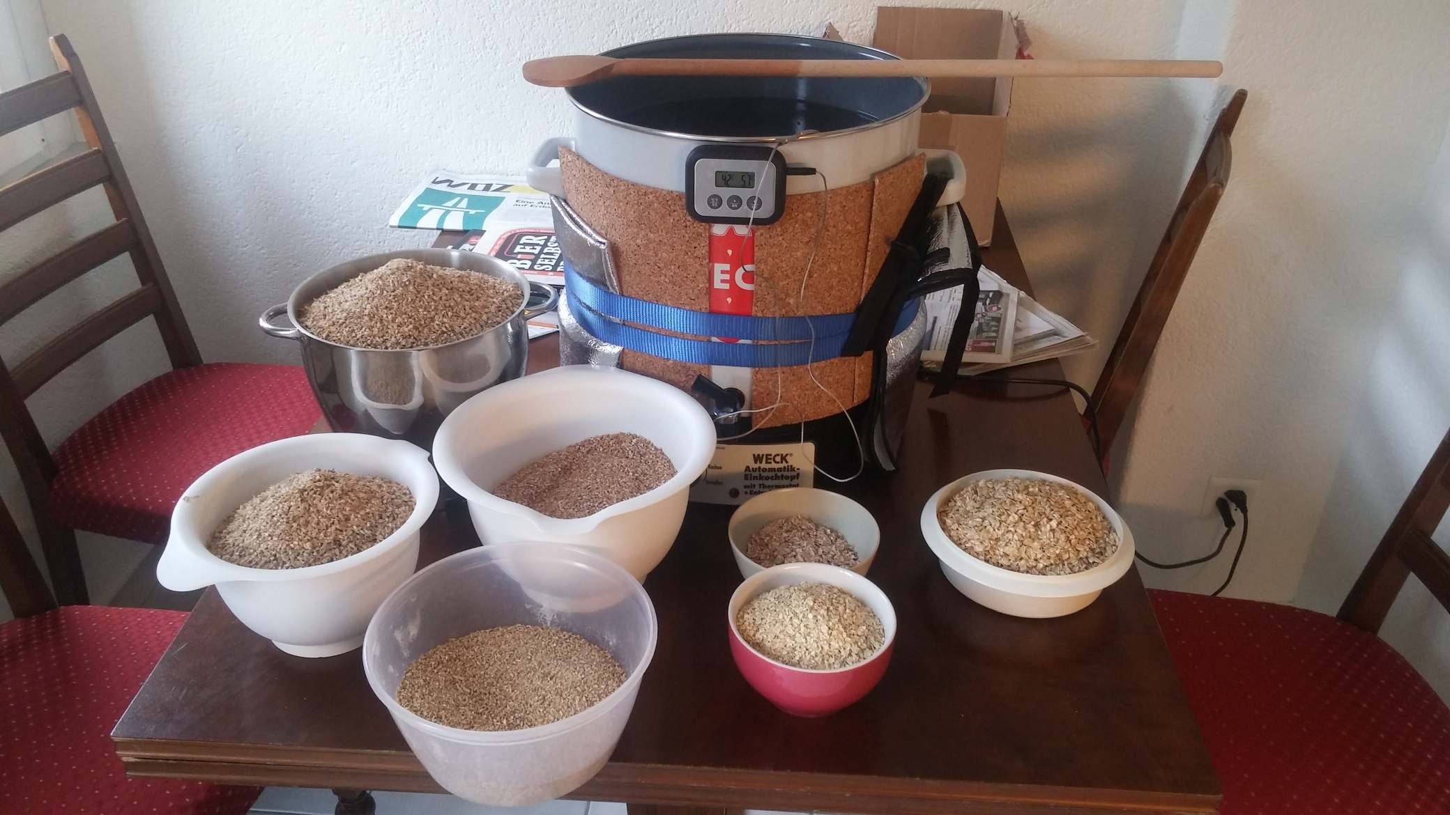 - Mis en place für das Tripel: Es kamen Weizen-, Gerste- und Hafermalz sowie Weizen-, Gerste- und Hopfenflocken zum Einsatz. Ich habe auf die Zugabe von Kandiszucker verzichtet (u.a. weil ich beim Eintragen in den KBH nicht ganz den Überblick hatte)