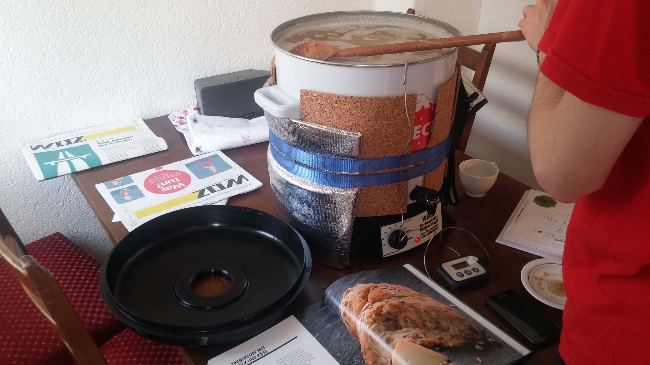 - Stammwürze war leider nur 17°P, angedacht waren 18.5°P. Entweder hätte ich bei 6 kg Malz auf 23 l Wasser die Rastzeiten verlängern müssen, oder länger kochen müssen. Das Mostfass hat ein schönes Jäckchen bekommen, damit schön dunkel ist. Evtl. schneidere ich mir eine Burka für das Fass (Aussen Weiss gegen Wärmeaufnahme, innen Schwarz wegen der Dunkelheit) damit ich keine alten Kleider verwenden muss.