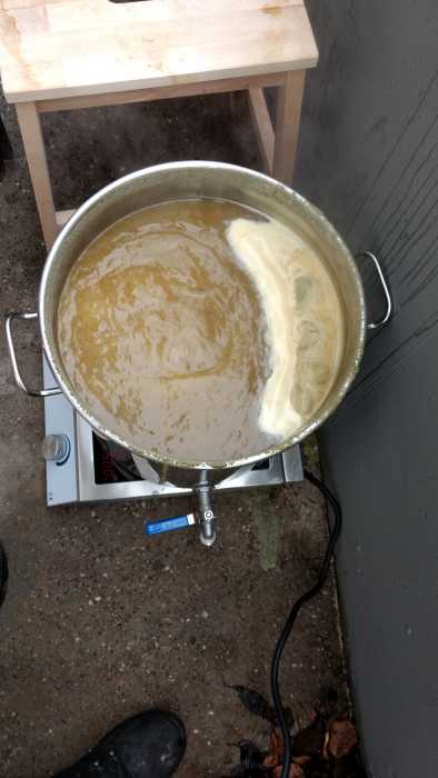 HG waren 15l @ 75°C. Da da Malz mit 12°C zu kalt war, sank die Temperatur auf 64°C, so dass ich 2,5l kochendes Wasser nachgegeben habe => 66°C.