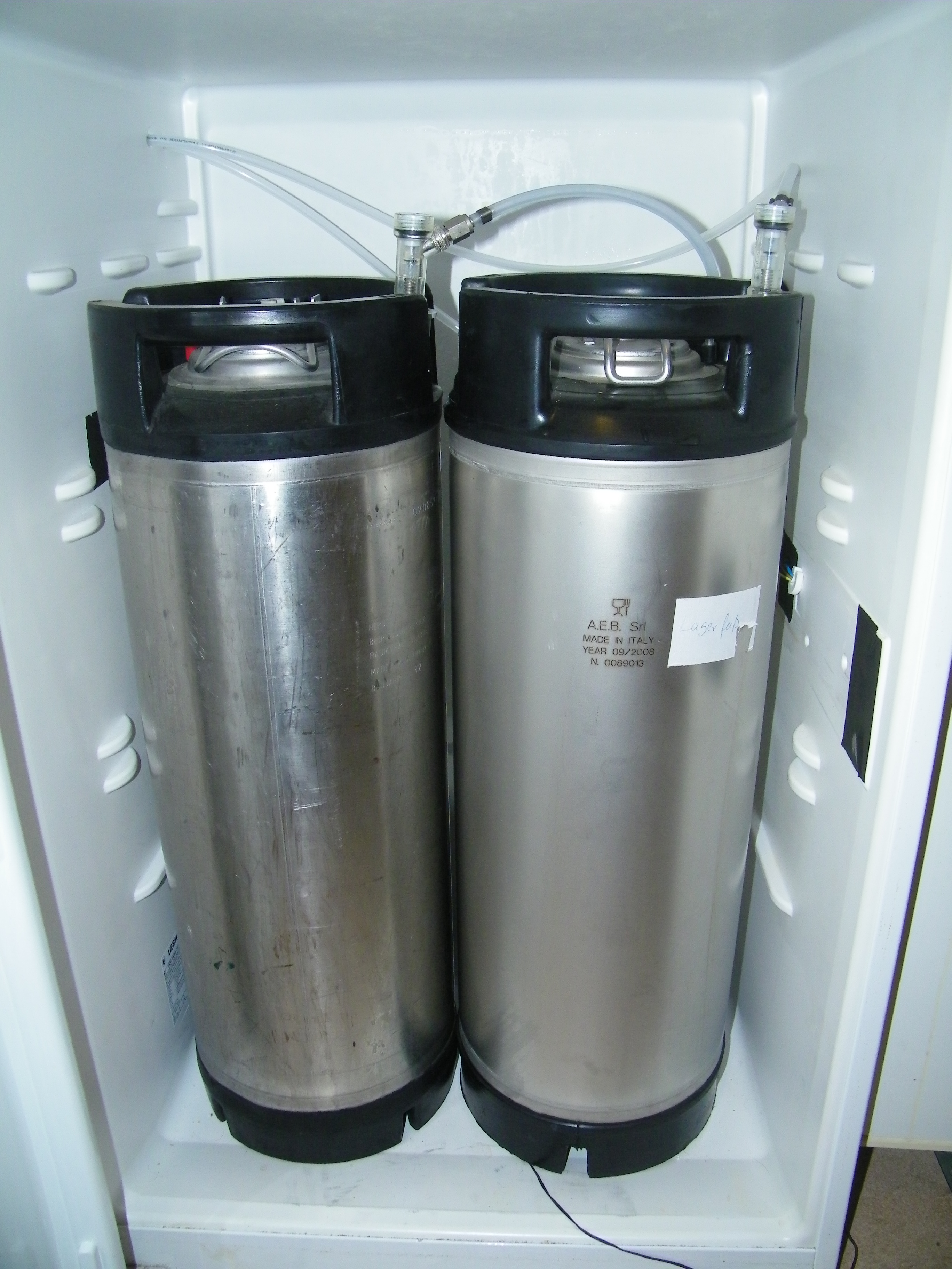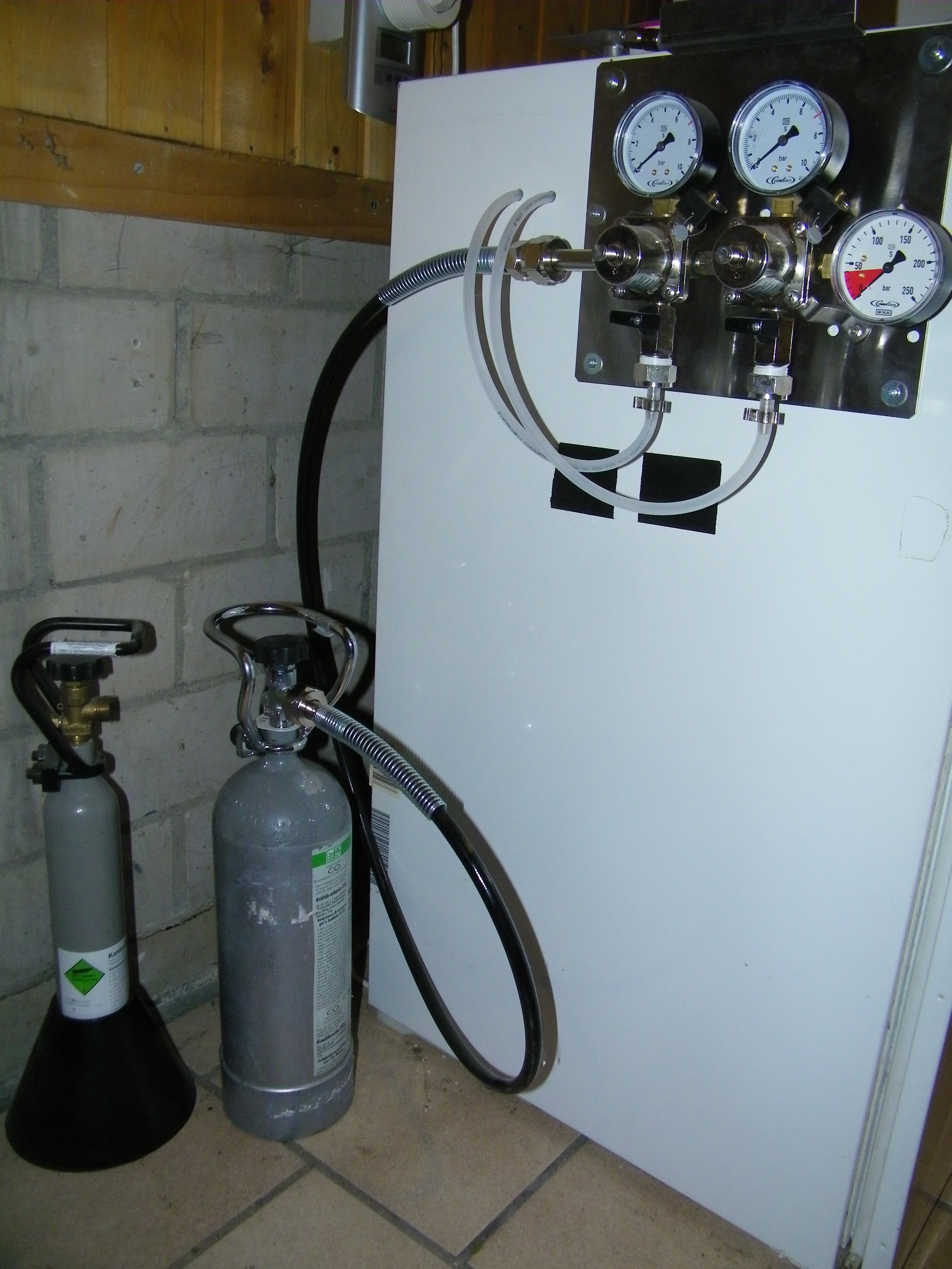 Wenn die Gärung durch ist, kommt das Jungbier zum Reifen in NC-Kegs und dann ab in den Kühlschrank. Kohlensäure bringe ich über Karbonisierung mit der CO²-Flasche rein, dazu habe ich mir am Kühlschrank eine Druckminderertafel mit 2 Ausgängen angebaut und die Leitungen nach innen verlegt, so muss ich nicht jedes mal den Kühlschrank öffnen und komme bequem von außen ran.