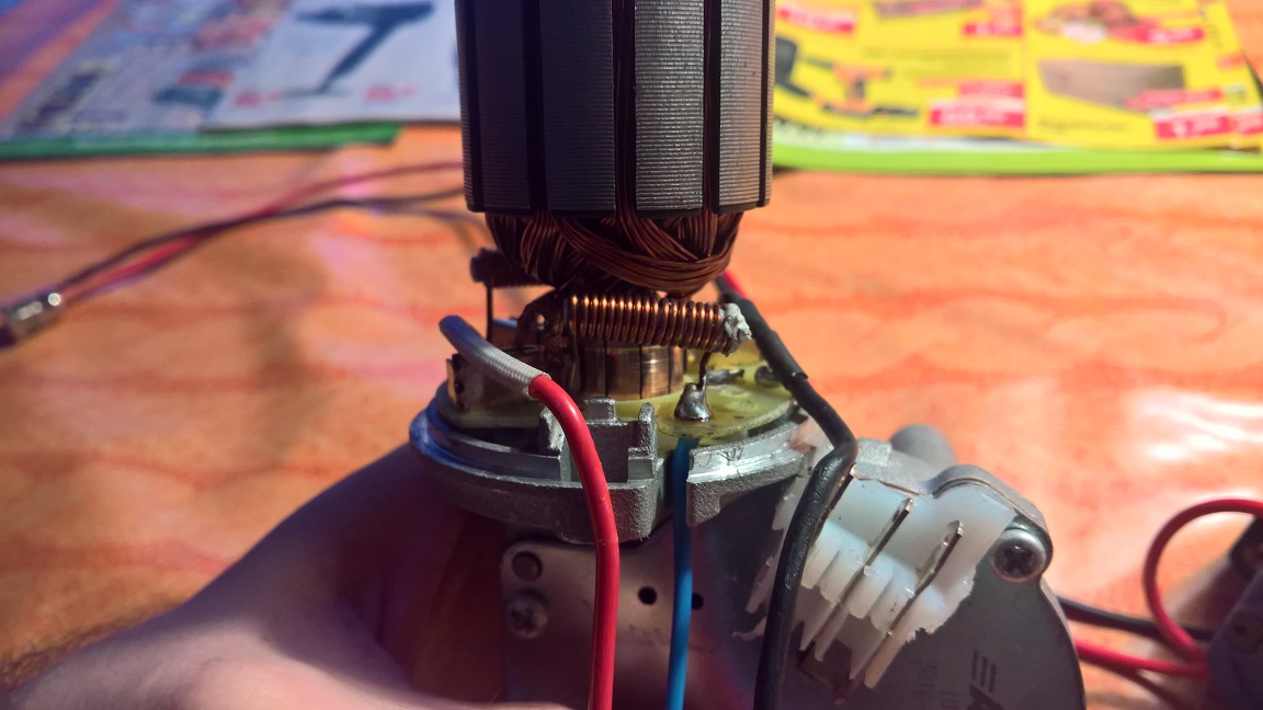 Also Minus der Batterie ans Gehäuse vom Motor und Plus an eine der Drähte oben. Dann läuft er schnell oder langsam...