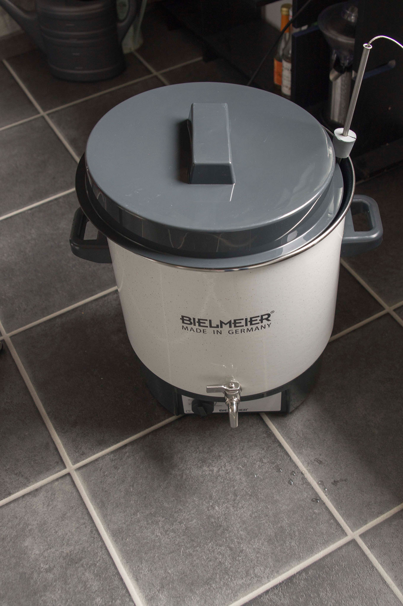Gebraut wurde folgendes Rezept: Hier mal das Herzstück seiner Brauanlage: Geläutert wird in einem 35L Filterbottich von Braupartner: Hier wurden insgesammt 5,4KG Malz in ~21L Hauptguss eingemascht: Nachdem alle Rasten wie im oben genannten Rezept gefahren wurden, haben wir geläutert. Dazu schöpften wir die Würze in den hier oben stehenden Läuterbottich: Nach zwei Litern Würze lief es schon sehr klar, habe davon leider kein Bild, daher mal hier die Würze im Schlauch, auf dem Weg in die Sudpfanne: Hier zu sehen eine Läuterspindel direkt in der Sudpfanne: Als wir den gewünschten Plato Wert annähernd erreicht hatten (Sudpfanne war voll, daher etwas früher aufgehört): Auf dem Weg zum kochen: Daher hab ich halbherzig ne alte Isomatte drumgelegt, dann ging es langsam bergauf...: Nun hab ich es leider versäumt die ganzen Hopfengaben zu fotografieren, hier aber ein Bild gegen Ende des Hopfen kochens: Hier der Aufbau zum Hopfensaien: Der angedrehte Whirlpool: Hier erscheint langsam der Trubkegel: Hier der Trubkegel am zerfallen: Angestellt wird das ganze nachher mit der Maisels Weiße Strip Hefe. Bin da sehr gespannt, habe bisher noch nie gestript. Scheint aber ganz gut funktioniert zu haben