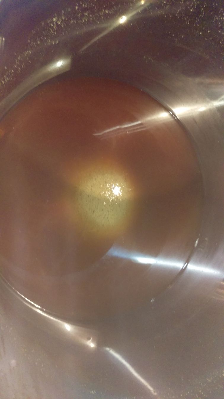 Abläutern, ist das graue ausgeflocktes Eiweiß? Ausbeute, weiß leider nicht genau wieviel Liter das sind, wir schätzen so um die 20! Zukochen mit Töpfen, da die Heizleistung leider nicht reicht und leider auch kein Tauchsieder aufzutreiben war! Arbeitsplatz Bereit für den Whirlpool Kegel wird sichtbar Letzter Rest, so ca 1/2 L Bescheidene Ausbeute So gut wie kein Hopfen im Filter, perfekter Whirlpool, eine der wenigen Dinge die einwandfrei funktioniert haben! Stammwürze nach Hopfenkochen, bei ca 25°C, gute 16°P Hab das ganze dann nochmals mit 7 l abgekochten Wasser gestreckt, also ja High Gravity gebraut!