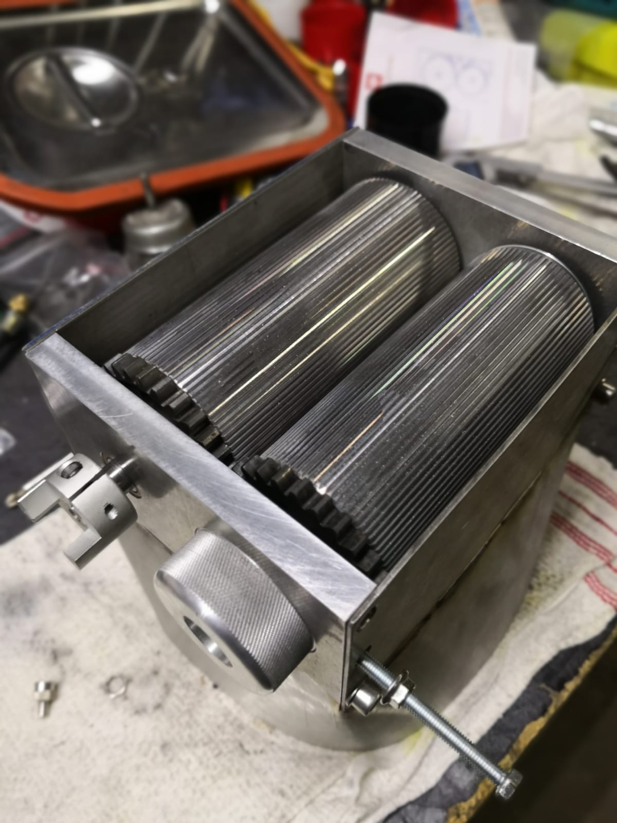 So, und ich habs doch gemacht! Wollte ne Mühle haben und diese nicht kaufen... Der Prototypen Status ist erreicht und die ersten 20Kg sind leicht konditioniert durch gegangen. Den Trichterfuß muss ich nochmal bauen. Habe dem Zulauf zu wenig aufmerksamkeit geschenkt. Daher auch die Bleche an den Seiten. Geht jedenfalls recht gut mit 1,6mm Spaltmaß und ca 100/min. Musste man mal direkt mit einer konventionellen vergleichen.