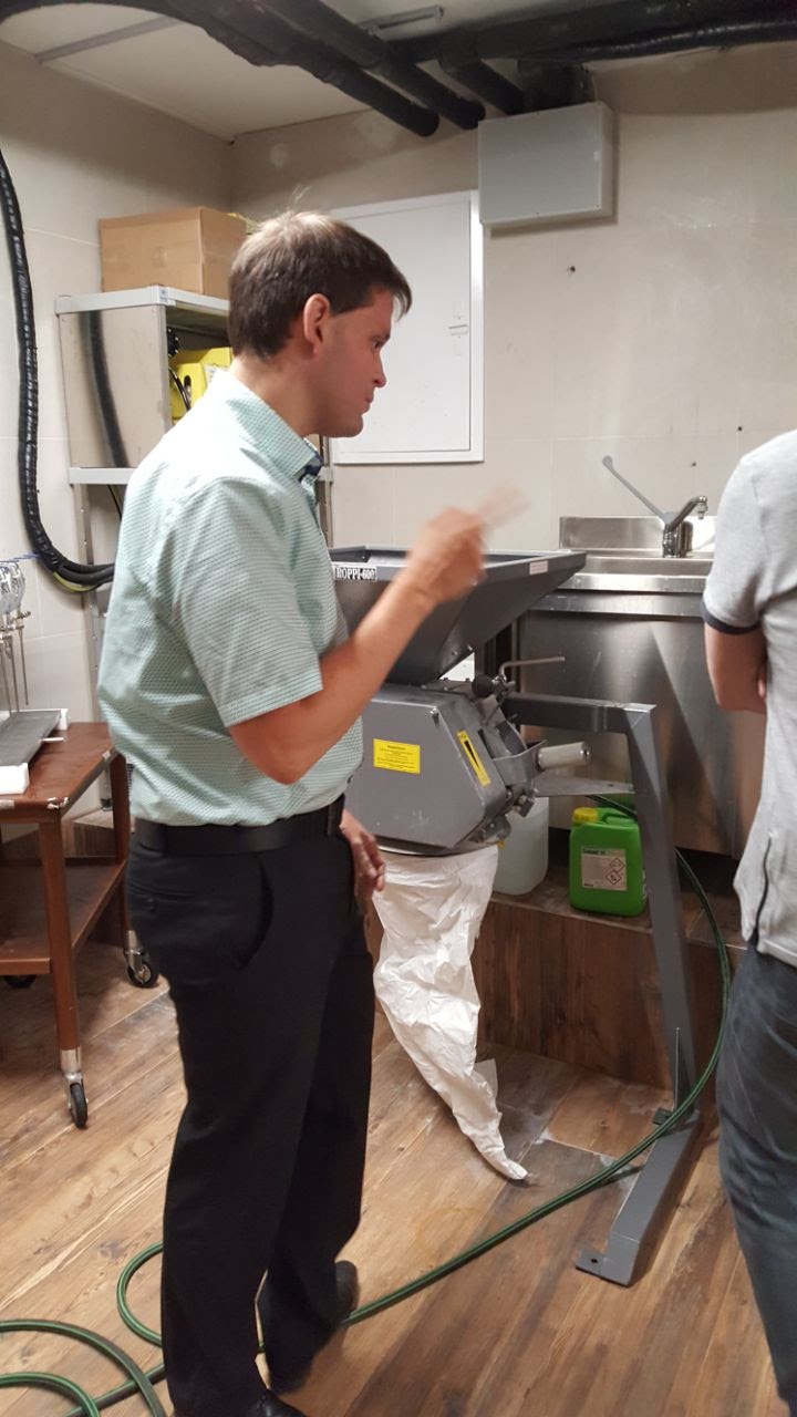 Am Abend haben wir dann die Brauanlage, Gär- und Lagerkeller besichtigt und das Malz gewogen und geschrotet: