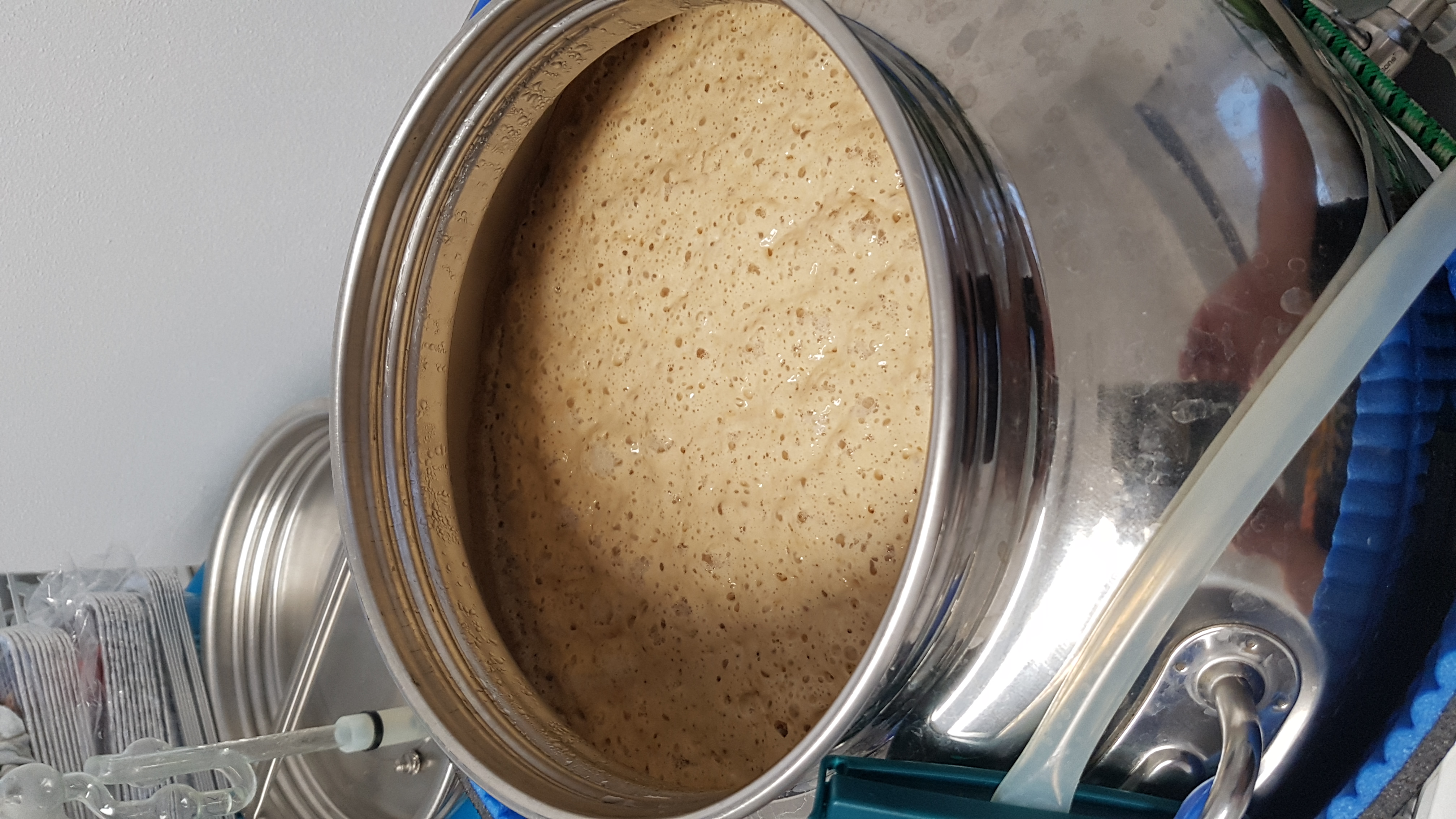 Mittwoch, 07:00 Uhr: Der Schrank mit dem Starter riecht schwer hefig, jedoch sieht der Starter ganz schön tot aus. Naja, denk ich mir, musst ja fast anstellen, mangels alternative und Refraktometer. Leicht mulmig is mir schon dabei, die Würze jetzt bei 30 °C stehen zu lassen und unsicher zu sein, ob das mit der Hefe was ist.
