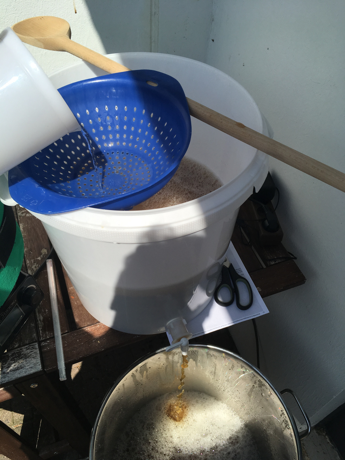 Der Nachguß fließt oben durch das Spaghetti-/Nudelsieb. Unten läuft die Würze in den 50 Liter Topf.