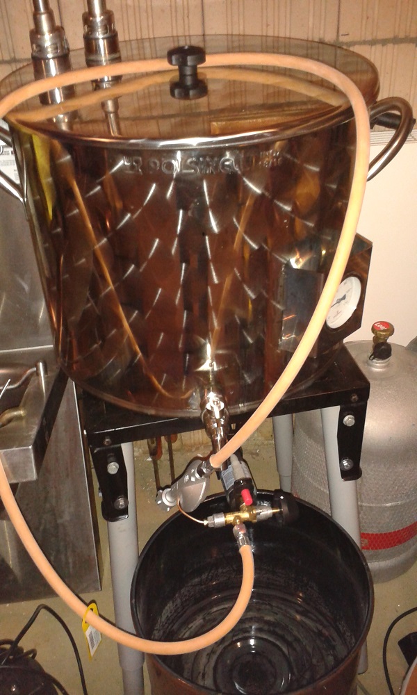 Kochtopf und Gaskocher Leutertopf mit Leuterblech und Gärbottich Gegenstromkühler selbstgebaut.
