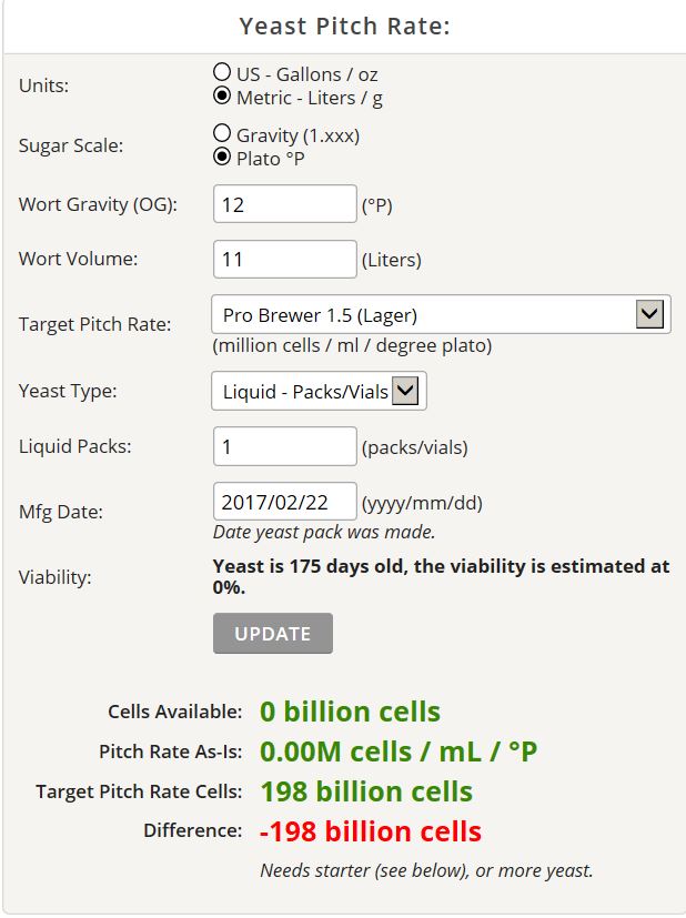 Wenn ich jetzt aber annehme, es sind noch 1 Million Zellen am Leben und ich die in 2 Liter Starter mache, spuckt er mir das hier aus:
