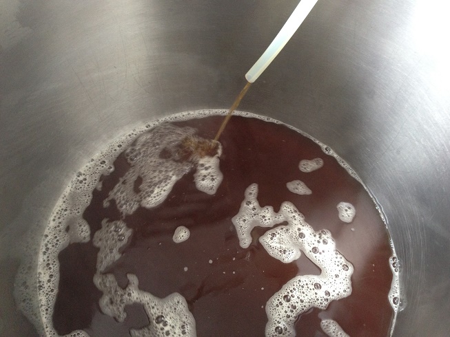 Eine kurze Prüfung der Würze ergab das Ergebnis von 23 Brix, da muss also noch einiges geläutert werden. 16,5°P brauche ich, dann geh ich sicherheitshalber mal nur auf 15 Brix runter. So wurde es gemacht, und am Ende hatten wir 43l im Kessel. Im Läuterbottich war immer noch einiges an Nachguss drin. Das war bei mir noch nie so, und daher überlegte ich, was damit machen? Habe dann einfach mal insgesamt 5L rauslassen, und dachte mir, das eignet sich gut für Hefenvermehrung oder hinterher zum verdünnen.