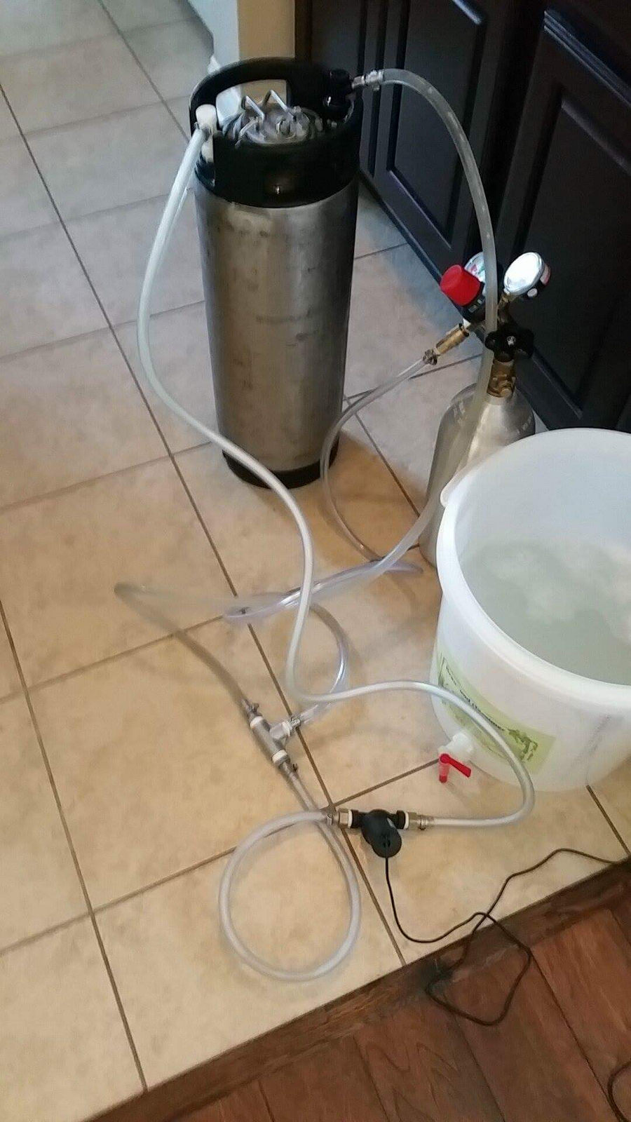 Nach dem Schlauchen aus den Gäreimer ins KEG, schließe ich für ca. eine Woche die Co² Pulle an bei ~ 2-2,5 bar.