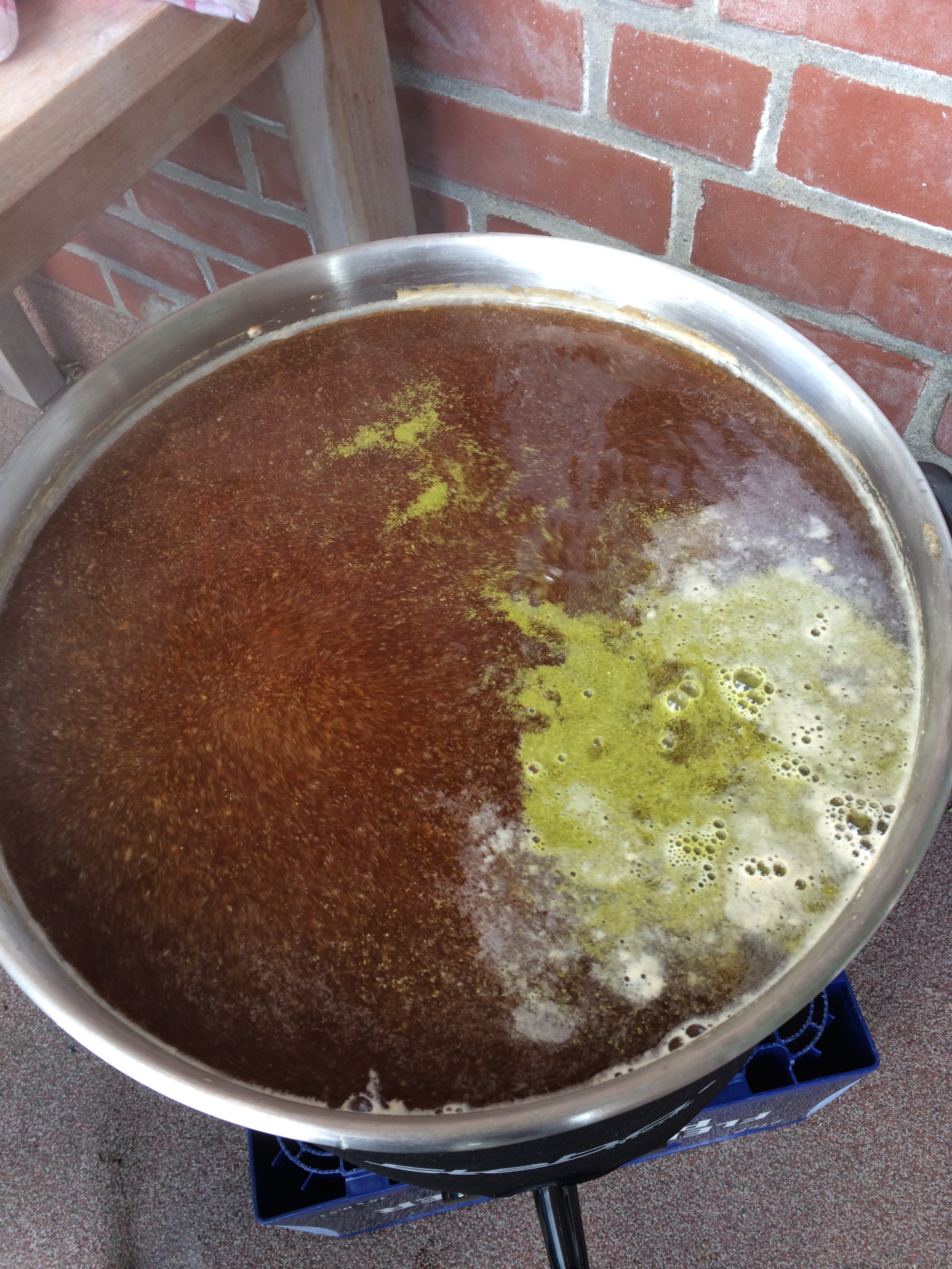 Jetzt warten wir auf das wallende Kochen. An dieser Stelle muss ich sagen, dass ich rund fünf Liter mehr Würze hatte, als in meinen Topf passt, was wohl auch daran lag, dass ich das Rezept auf eine Ausschlagwürze von 23 Liter berechnet habe. Ich wollte die Würze auch nutzen, da sie noch rund 7,5 Brix hatte. Doch ich habe dann einfach ein wenig mit dem Hopfenkochen gewartet (rd. 30 Minuten), das Wasser verdampfen lassen und konnte dann die fünf Liter dazugießen. Somit hat die Würze etwas länger gekocht Frage an die Fachleute: Hat dieses Vorgehen Nachteile?