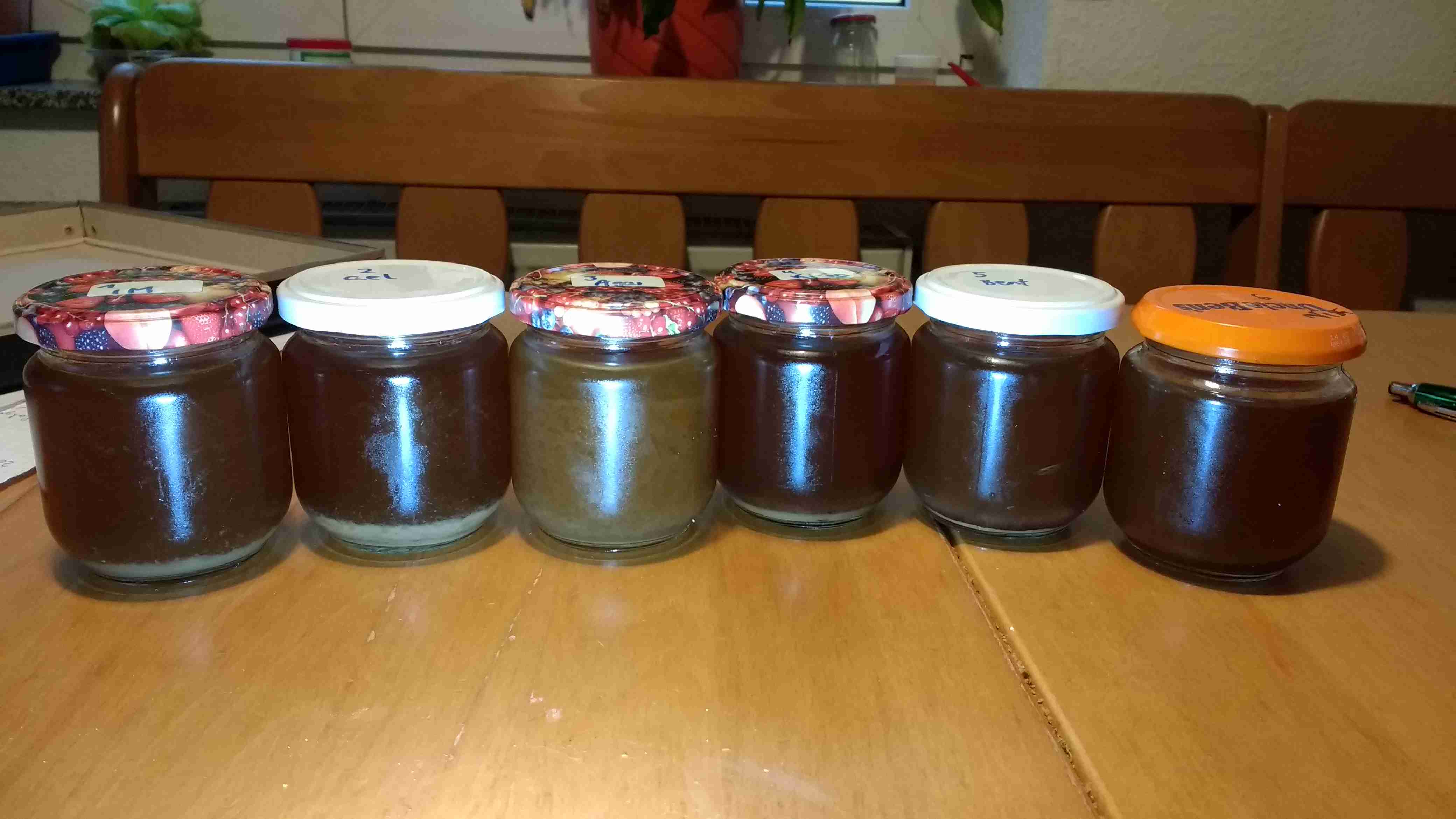 Von jeden Schönungsmittel wurden 0.5g in 50ml Wasser eingerührt, dann davon 5ml in die Gläser gefüllt und eingerührt. Das sollte ungefähr 5g Schönungsmittel auf 10 l Bier entsprechen.