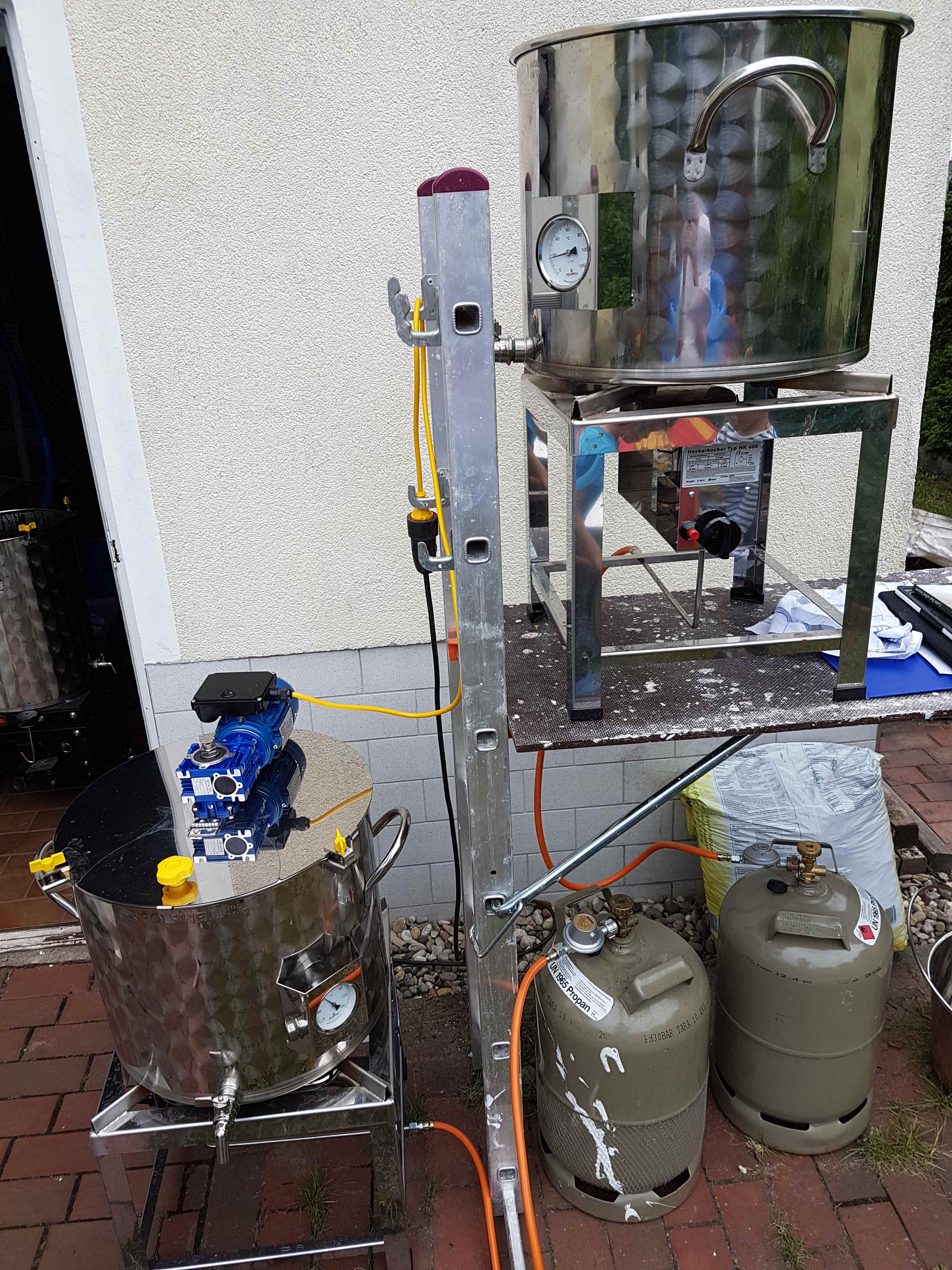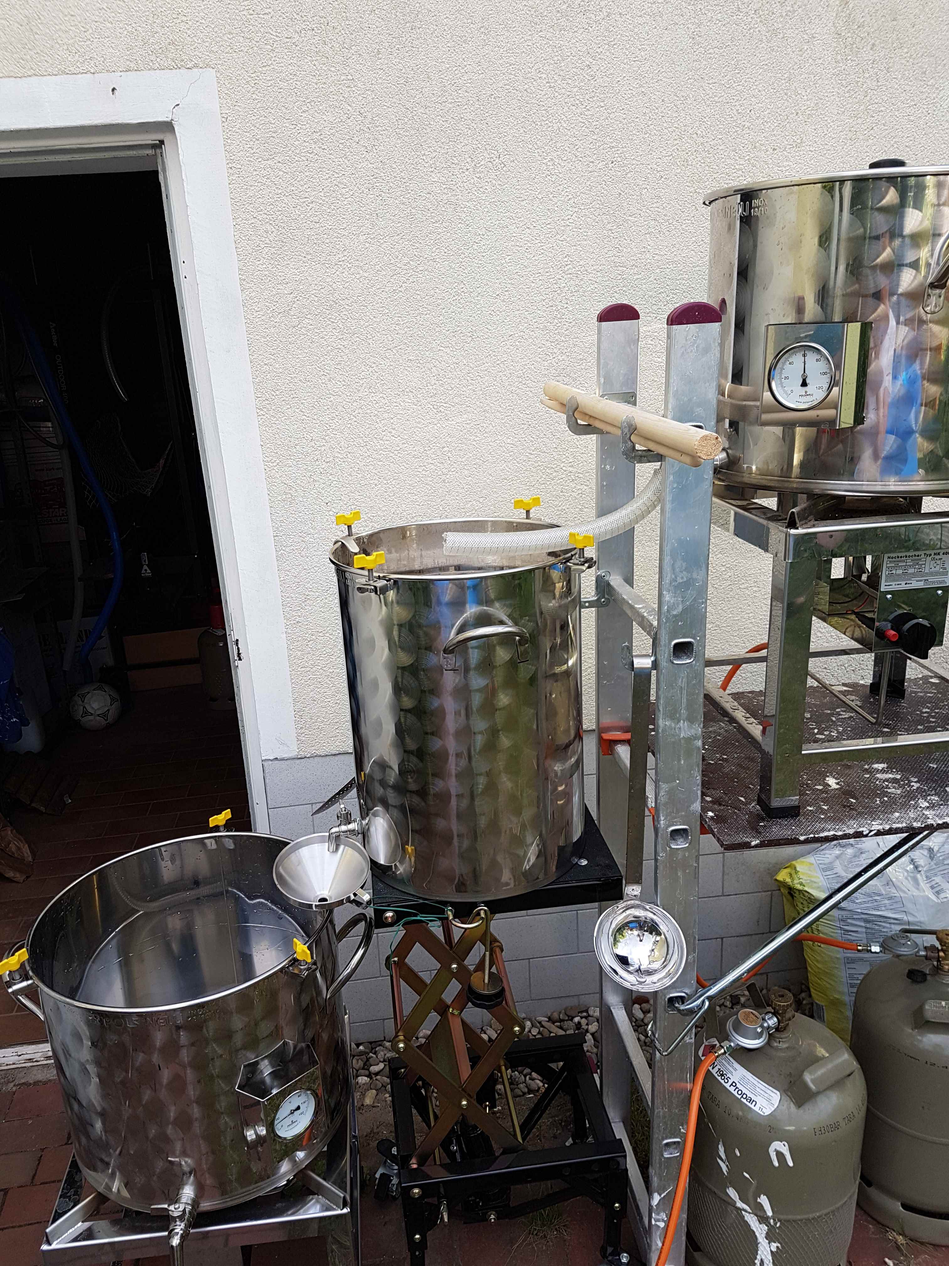 Dann kommt der größte Unterschied zu früher: Anstelle des Umschöpfens vom Maischekessel in das Läuterfass, setze ich jetzt den Maischekessel = Läuterfass auf meinen Hubwagen. Daneben wird der Sudkessel (75l) positioniert.
