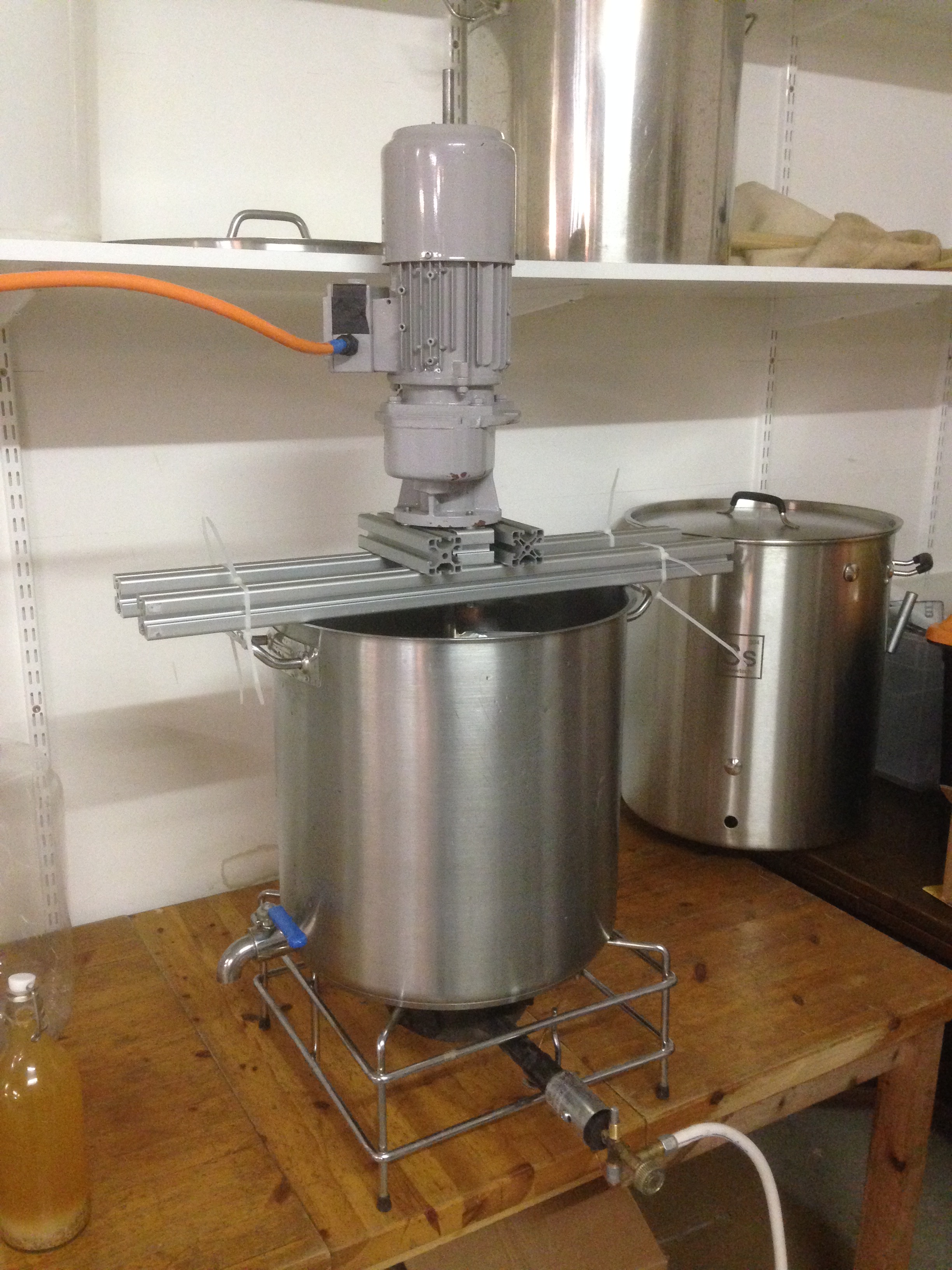 Ich habe mir ein Rührwerk gebaut. Edelstahl mit einem 0.25kw Getriebemotor welcher mit 30 u/min läuft.