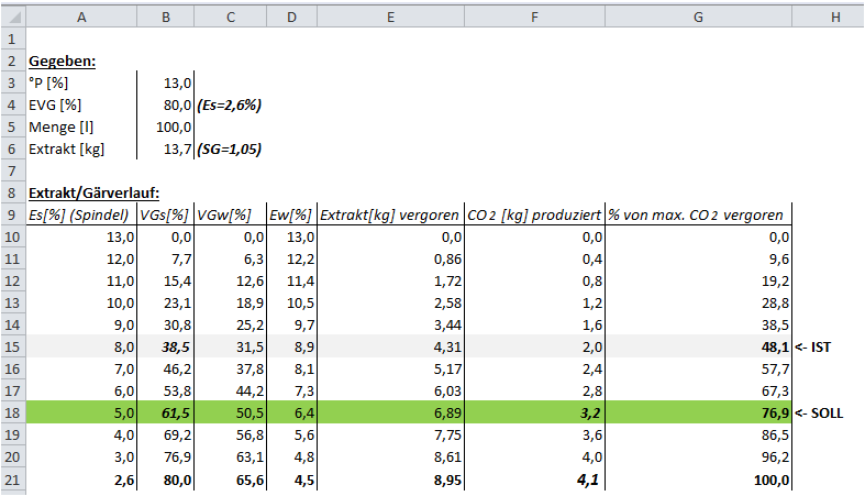 Die Zeile 18 zeigt in Spalte B einen Wert von VGs[%] = 61,5 - also zwischen 60-65% VGs, deswegen grün. Fischt man sich aus dieser Zeile den %-Anteil an CO2 der für den o.g. Zielwert VGs[%] vergoren werden muss(Spalte G), landet man bei 76,9% CO2 vergoren, bzw. bei 3,2 kg(F18).