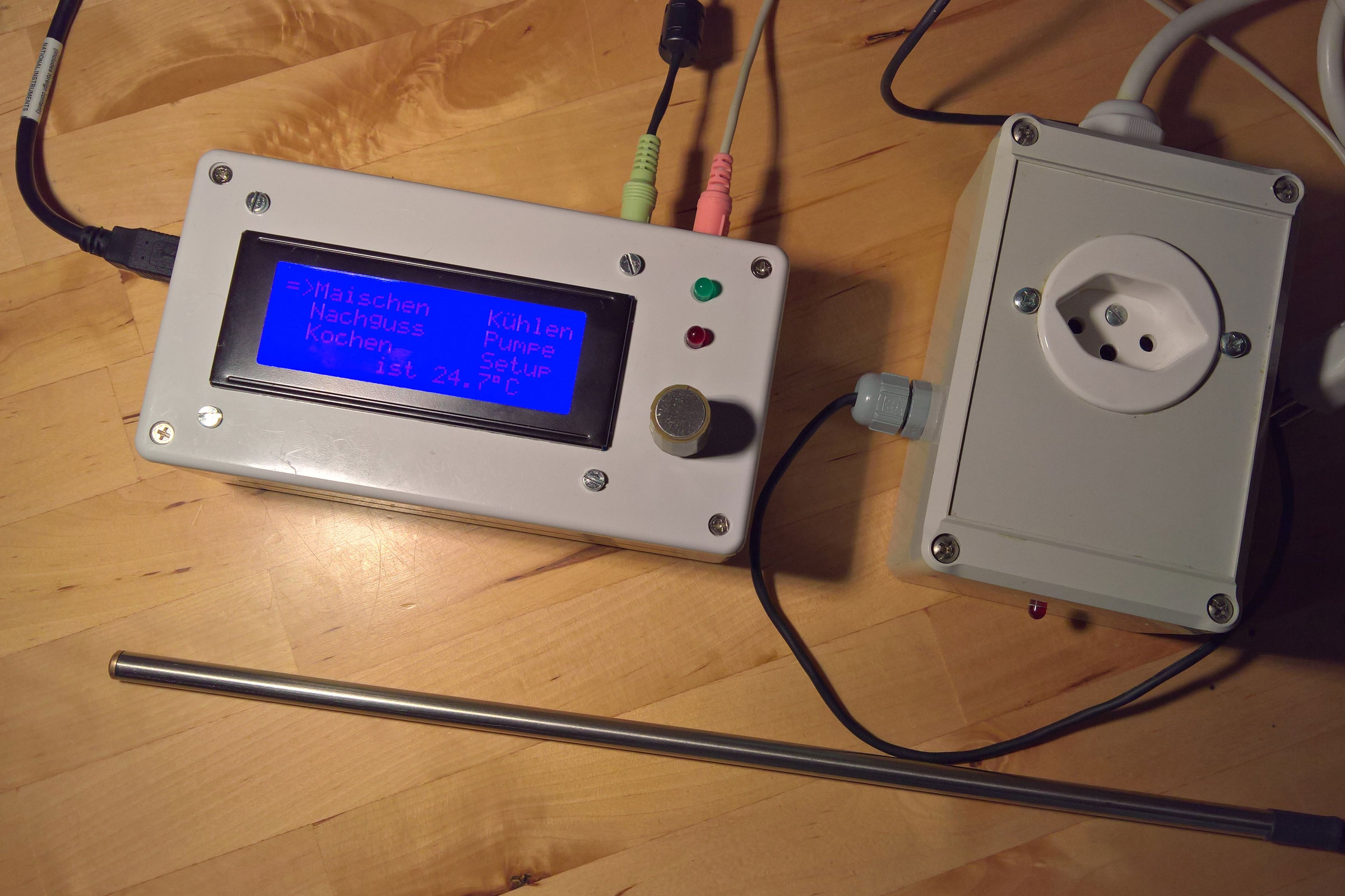 Ausserdem noch ein Bild von Steuerung und Thermometer. Das Relais habe ich in ein extra Gehäuse verfrachtet, die Steckdose ist ein Schweizer Modell ;-)