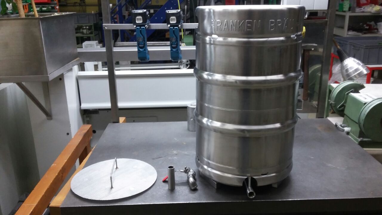 - geschenktes DIN-KEG einer Brauerei als Läuterbottich und Gährfass mit Zubehör