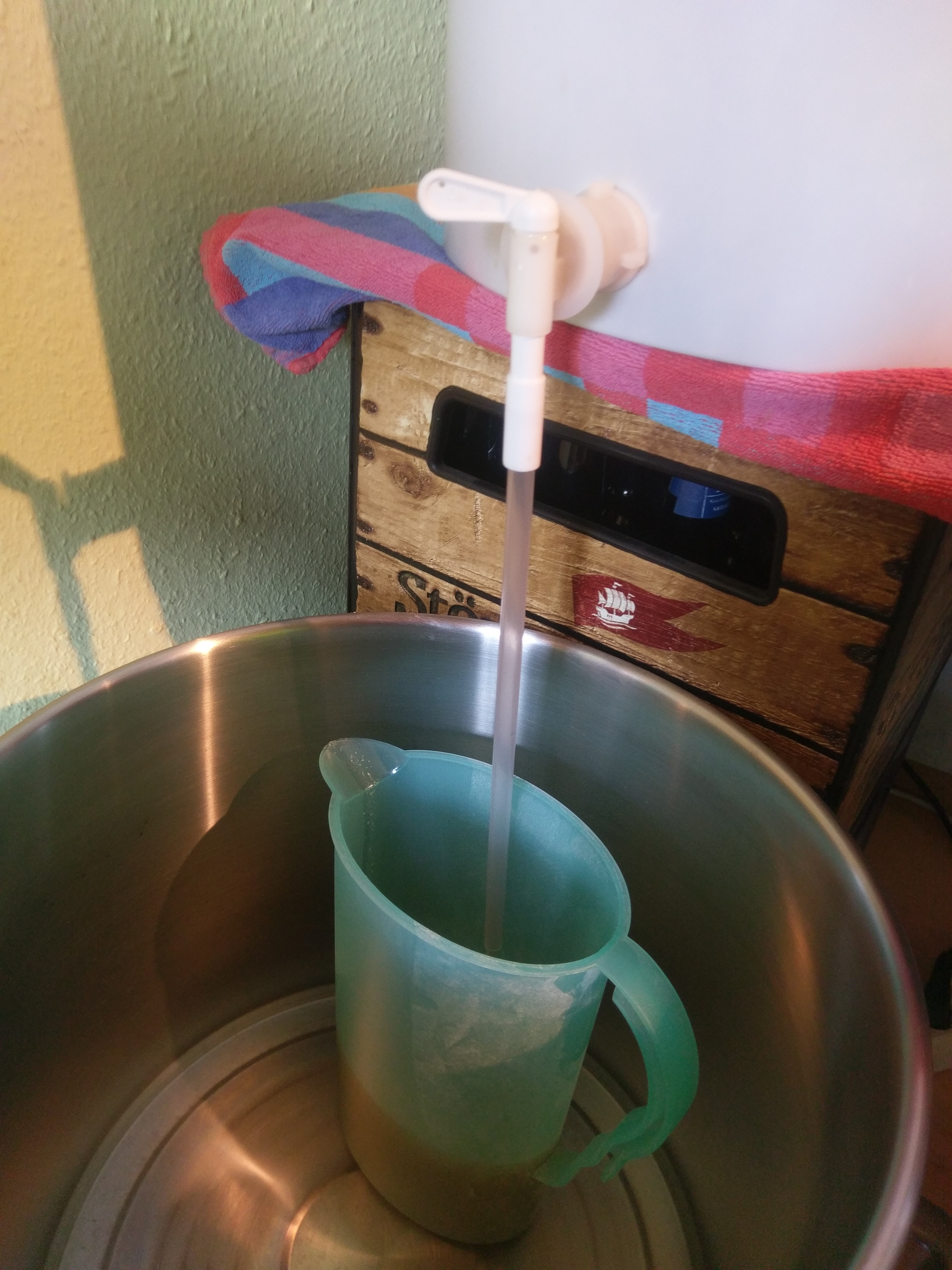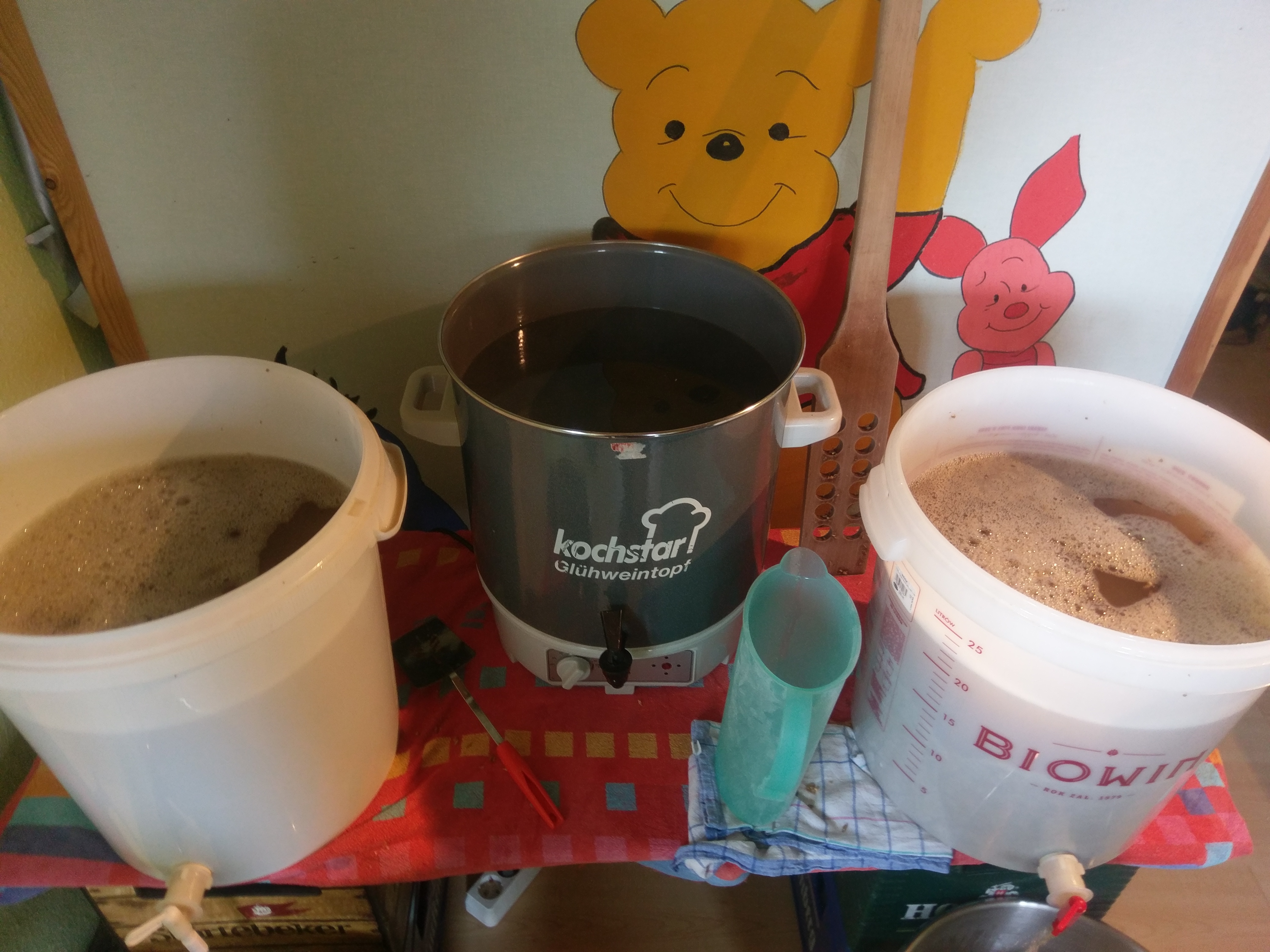 Nach 90 Minuten hochgeheitzt auf 77Grad um abzuläutern. Läuterruhe ungefähr eine halbe Stunde. Ich habe die ersten 5 Liter wieder oben rein gegeben bis es ein wenig klarer wurde. Nachguss bei 76Grad circa 12 Liter pro Topf. (Der Mittlere Topf ist nur für die Nachgüsse der zwei anderen)
