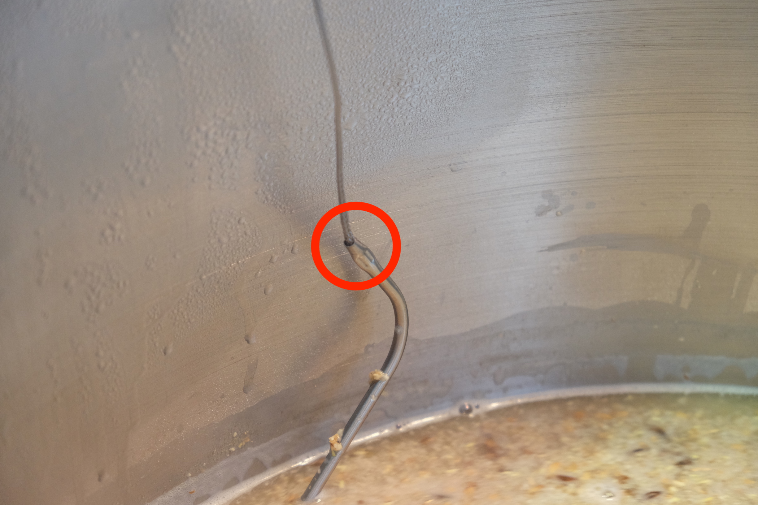 Es musste in die Thermometerspitze Wasser (bzw Maische) gelaufen sein (Siehe Bild), und zwar oben an den Anschluss der Spitze an das Kabel. Ich habe die Thermometerspitze dann abgespült. Praktischerweise hatte ich aufgrund des Wetters den Kamin an, der oben drüber ein Backofenfach hat - welches aktuell bei ca. 200° Temperatur war. Da hab ich kurzerhand die Spitze reingeschmissen um sie zu trocknen. Nach ca. 10 min hat das Thermometer die gleiche Temperatur angezeigt wie das Thermometer an der Backofenscheibe. Also Thermometer rausgeholt, abkühlen lassen, wieder ins Netzwasser - 13°. Top, hat geklappt. Rein in die Maische (diesmal aufpassen dass das Ende trocken bleibt) - 60° zeigte das Thermometer an.