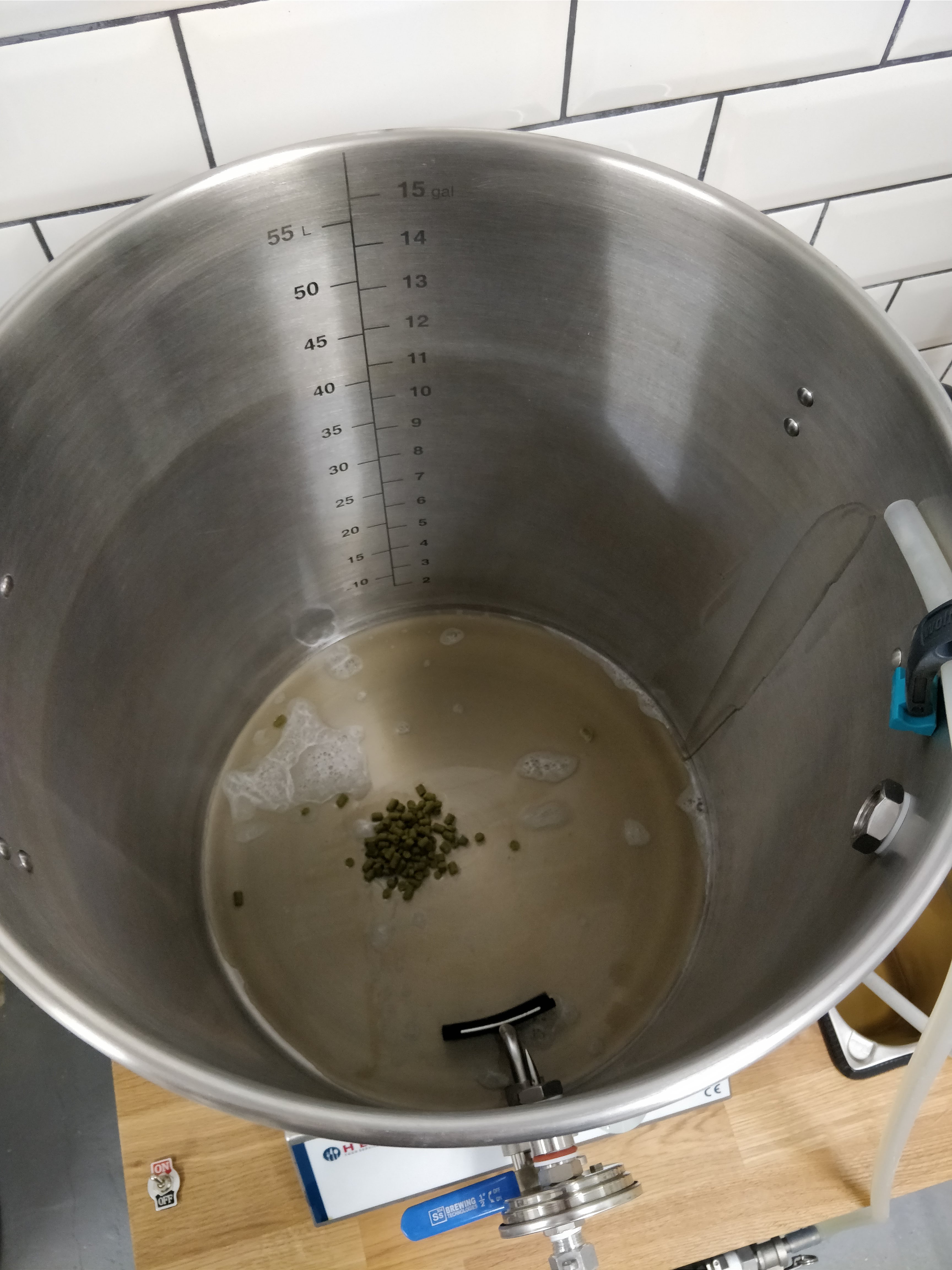 Gekühlt wird mittels Plattenwärmetauscher. Dafür kommt zunächst wieder der Grant zum Einsatz. Dort hinein fließt die Würze durch einen Hopspider und wird dann durch den PWT ins Gärfass gepumpt.