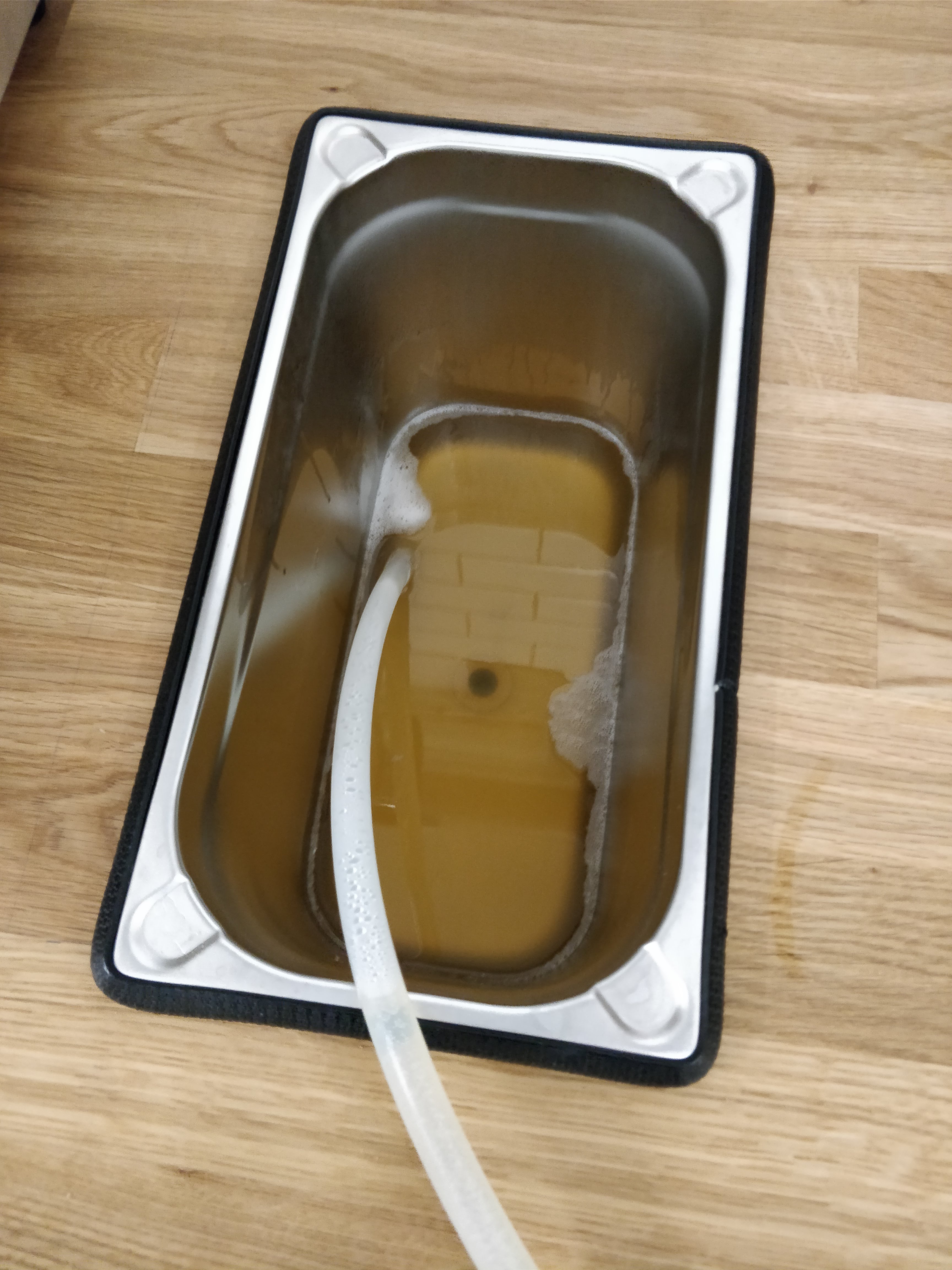 Ich Pumpe zunächst kochendes Wasser im Kreis (vor allem für PWT) und dann wird Reinigungsflüssigkeit aus dem Grant im Kreis gepumpt, danach klares Wasser und dann Starsan. Die Schläuche hänge ich dann zum Trocknen auf.