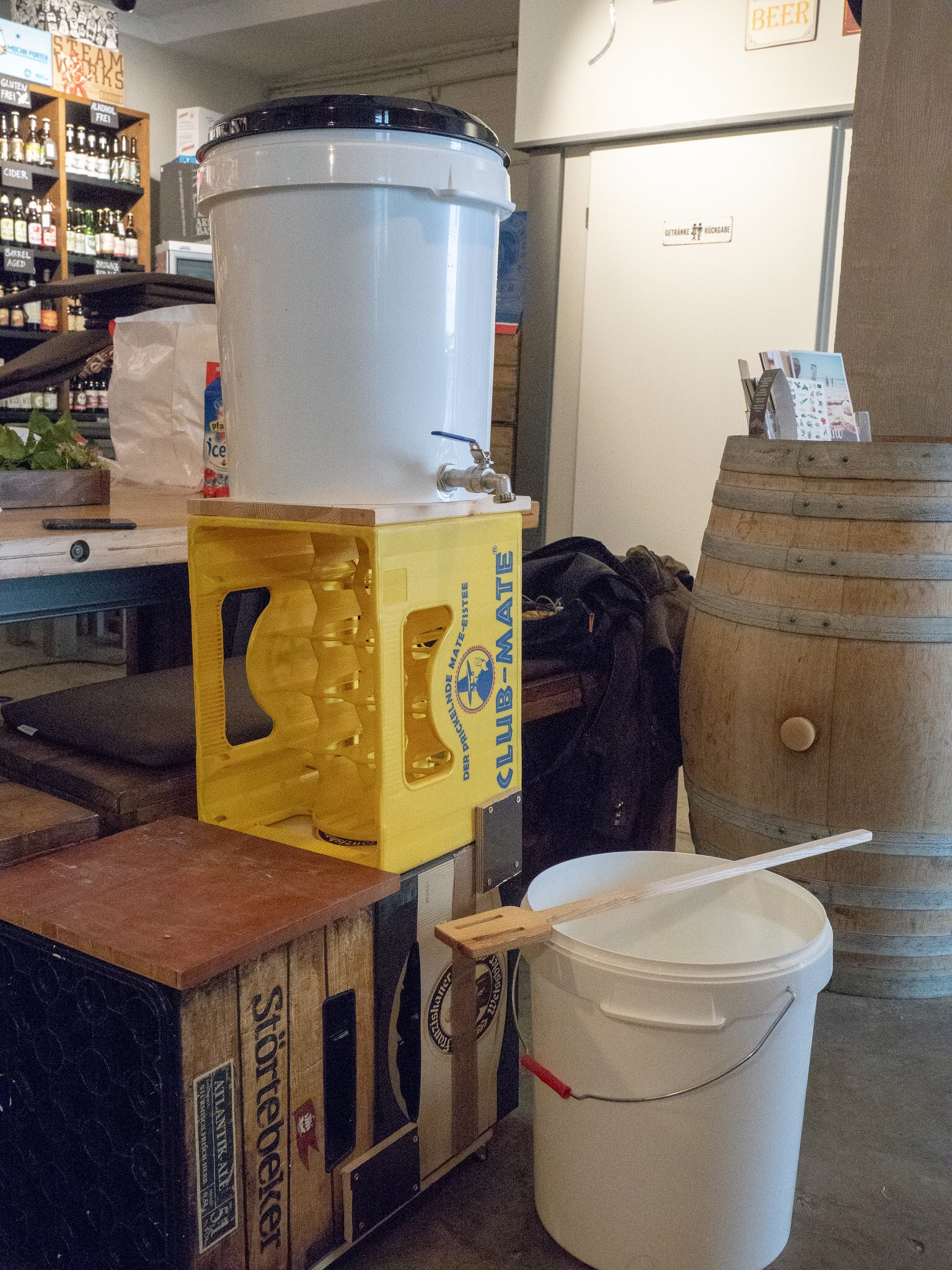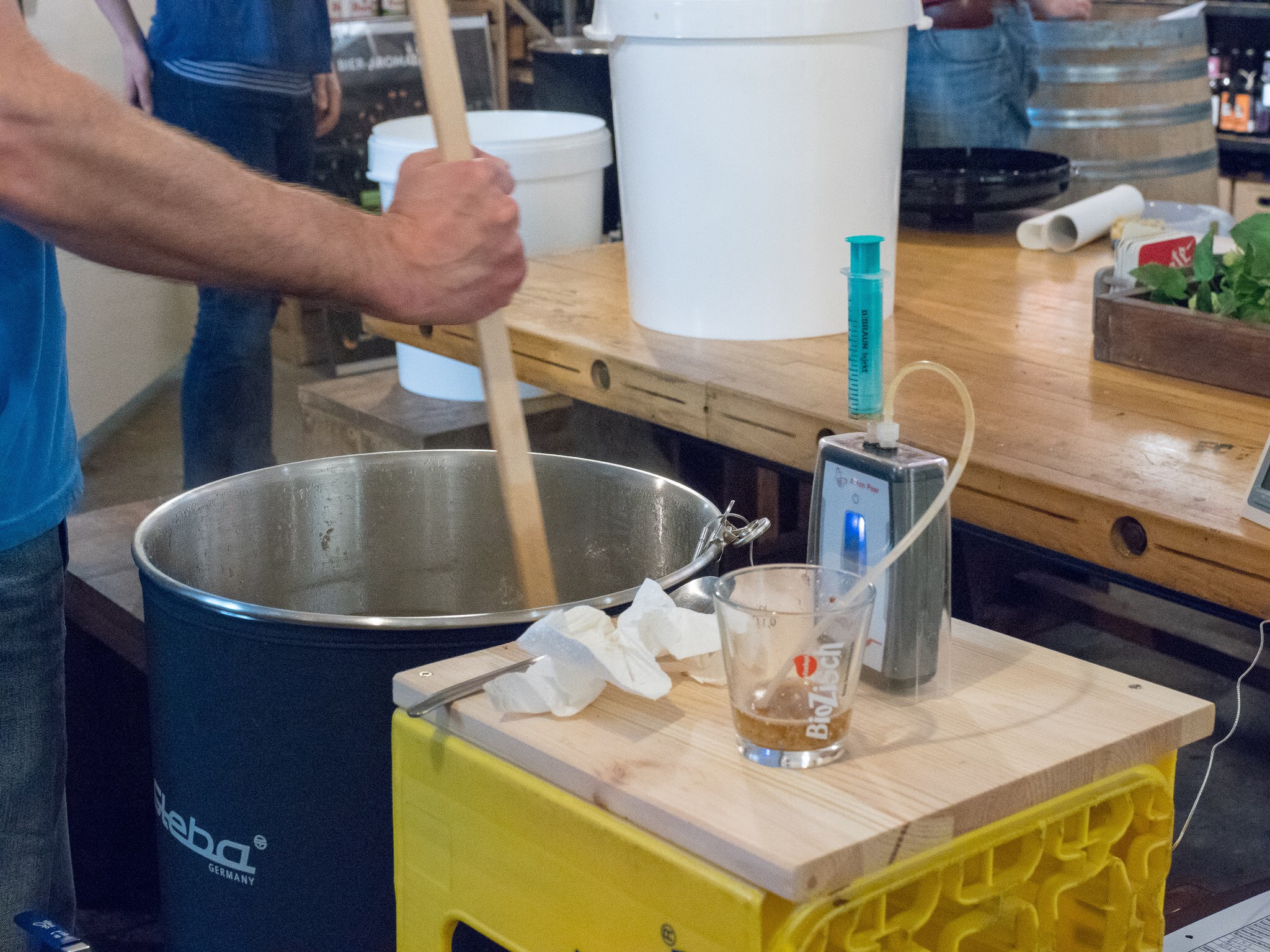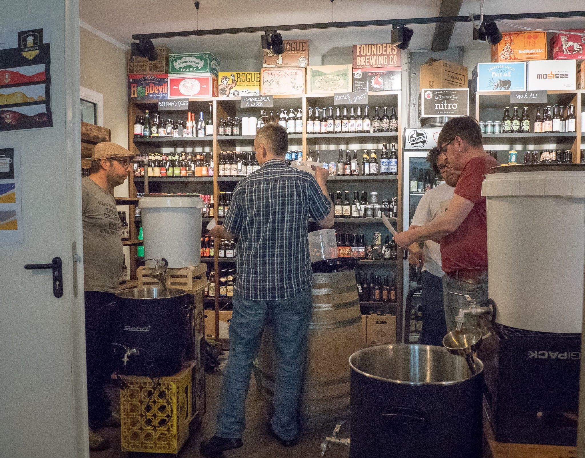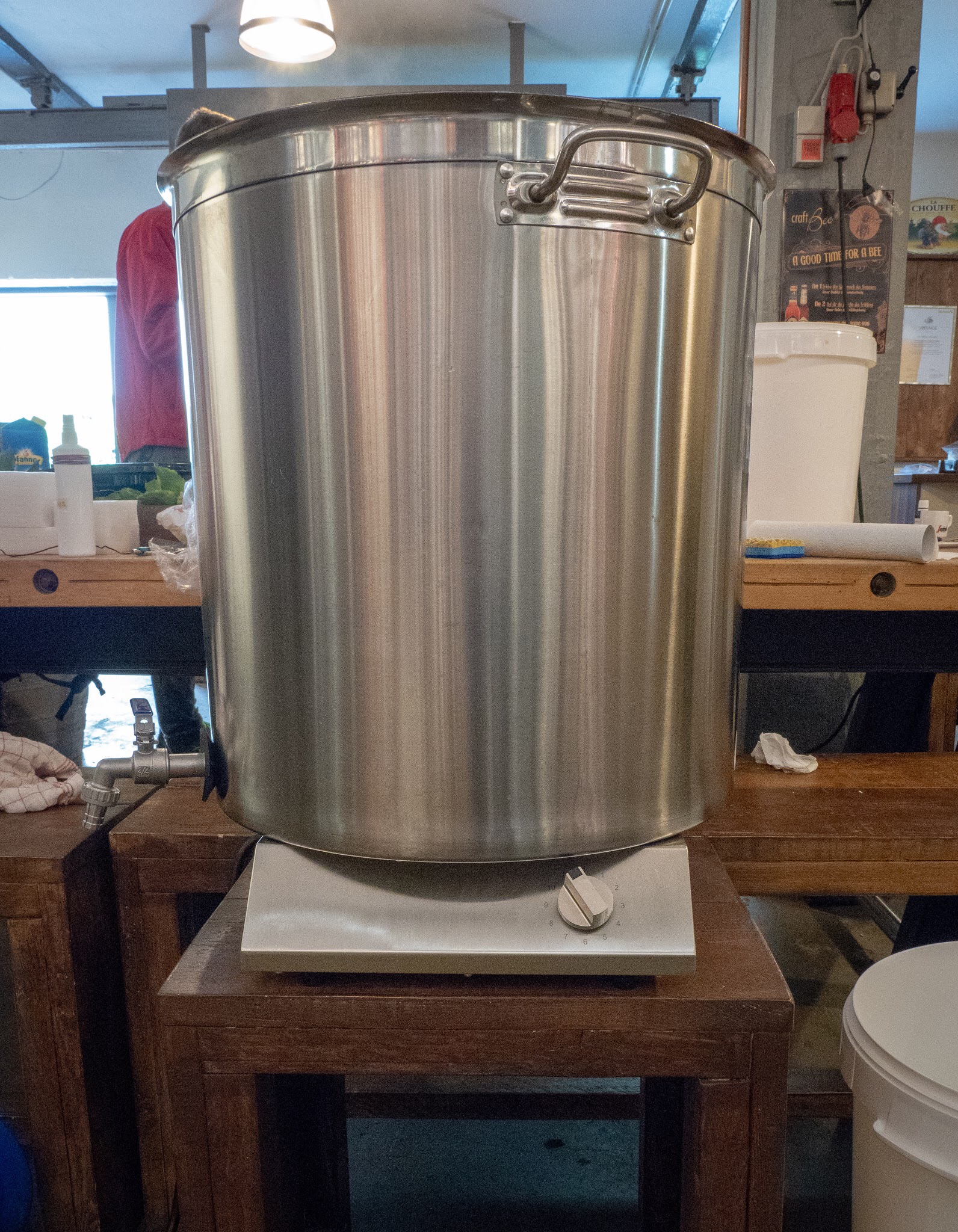 Am 29.04.18 haben wir einen kleinen Testlauf des Braukurssetups gemacht. Wir planen mit 8 Personen in 2er Gruppen an einem Einkocher mit Läutereimer. Einkocher, Eimer und alles was man sonst noch braucht ist bereits angeschafft. Die Gestelle sind lediglich Prototypen um zu sehen ob es sich bewährt und werden dann aus Alu Profilen gebaut. Der Brauraum der bereits komplett abgenommen ist war leider noch nicht leergeräumt weswegen wir teilweise in den Shop umgezogen sind. Es wurde an 4 Einkochern parallel gebraut. Zum Glück waren wir genug erfahrene Hobbybrauer die ziemlich eigenständig arbeiten konnten. Es war ja nur ein Test. Mit Kursteilnehmern würde es natürlich ganz anders aussehen.