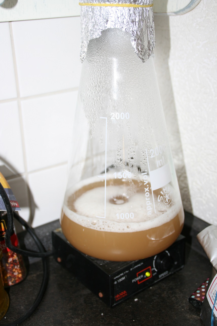 Die nächste Stufe ist das Zuführen von einer Würze aus 400ml Wasser und 32g DME. Auch diese Würze lasse ich dann für 24 Stunden auf dem Rührer stehen und wie man sieht, zeigt die Farbe des Inhaltes, dass die Hefe sich langsam vermehrt.