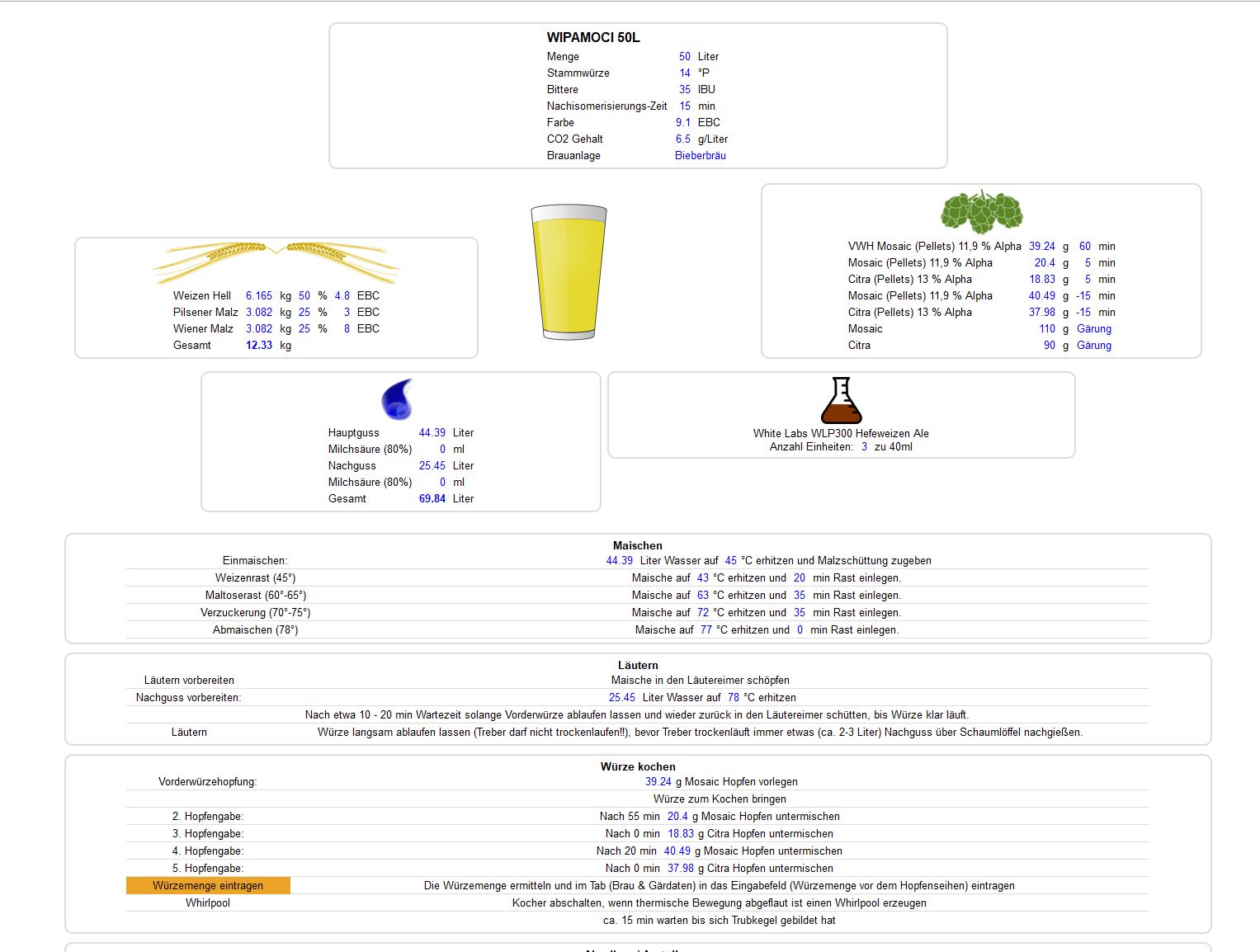Ich würde den Citra nicht als VWH nehmen, sondern nur den Mosaic. Die Vorderwürzehopung in der Menge um 50% reduzieren, dafür lieber die Gaben 5 Minuten vor Kochende einbauen / erhöhen sowie eine Whirlpoolhopfung von 2g/l einplanen. So bekommst Du deutlich mehr Hopfenaromen in Deine WIPA.