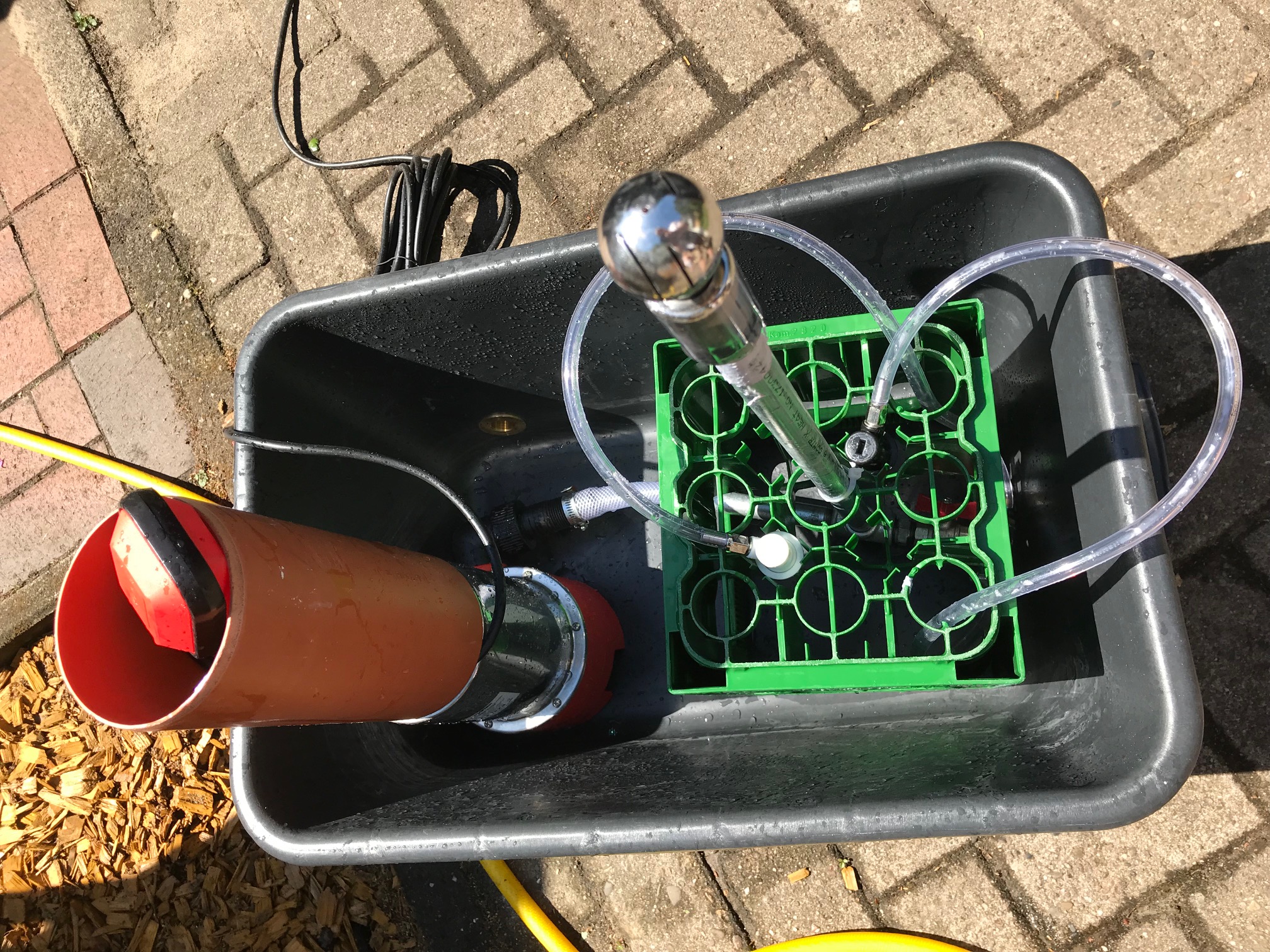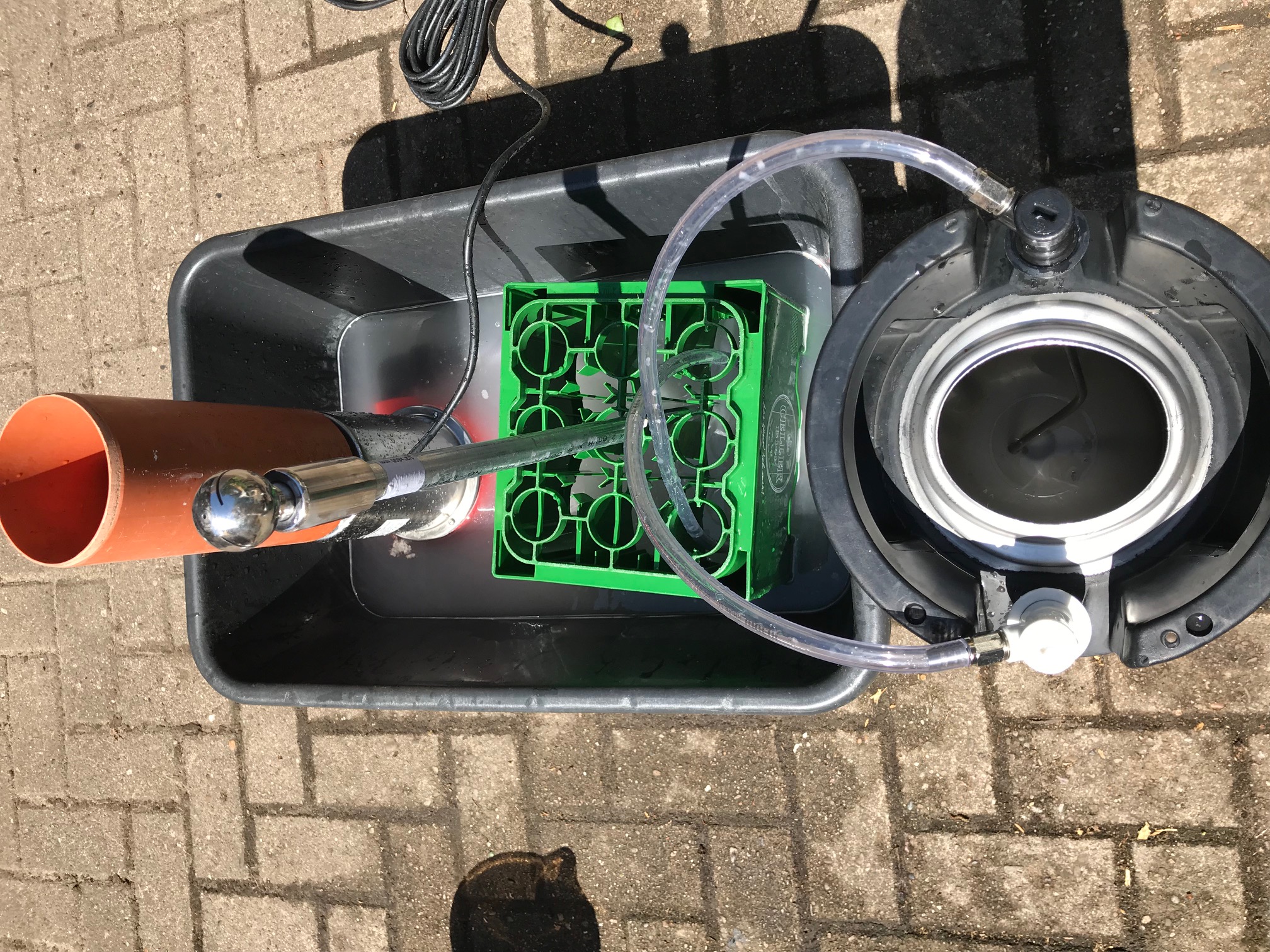 Der Grund war eine große Maurer Wanne (Neu) mit einer Leistungsstarken Grizzly Schmutzwasserpumpe (NEU ) 20.000 L /h hier habe ich noch auf meine China CIP Düsen gewartet, ausserdem musste ich das Rohr noch kürzen und ein neues Gewinde reinschneiden damit die CIP Düse ziemlich mittig vom Keg sitzt.