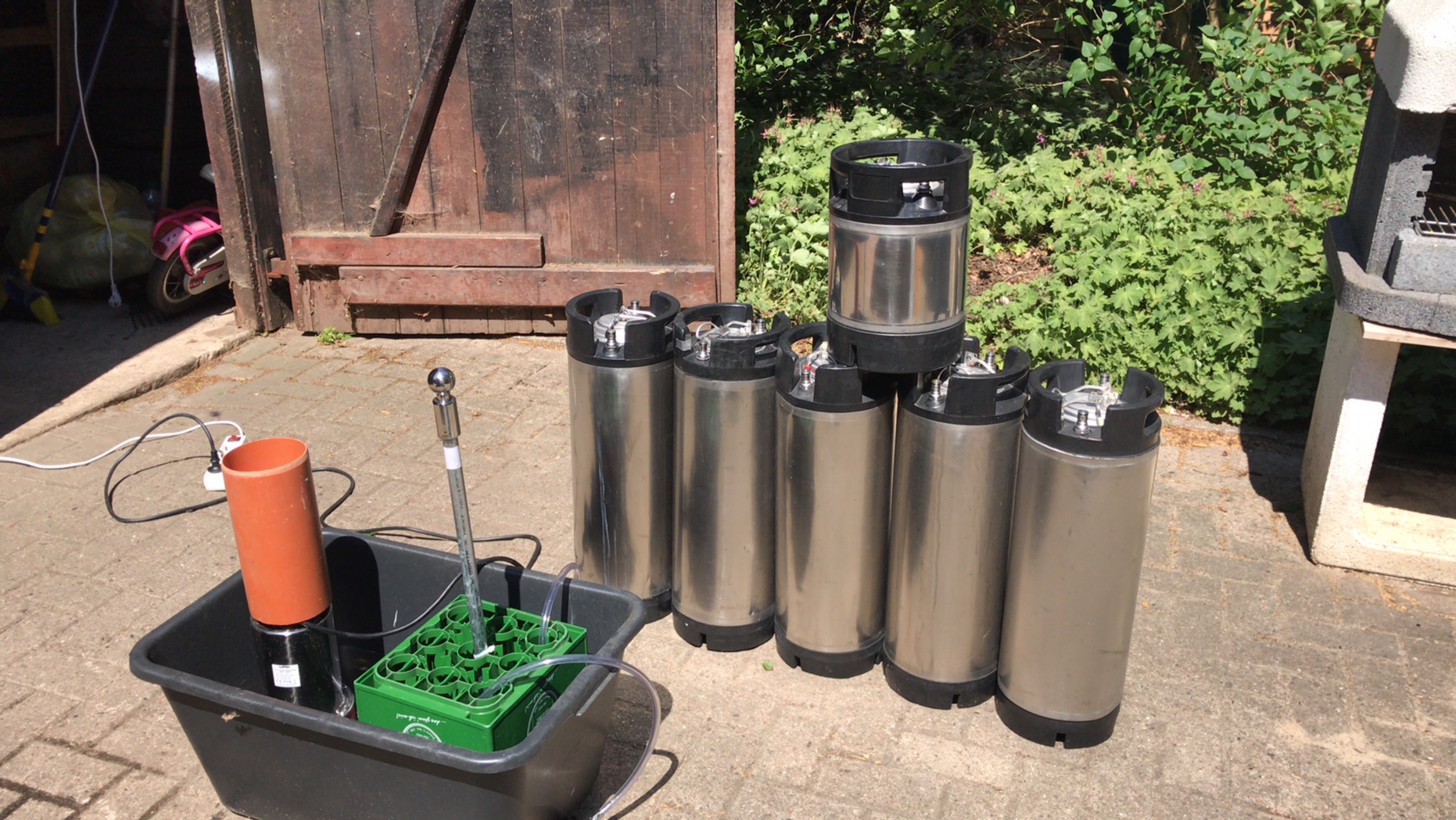 Vorher noch das Chemipro Oxi für den Waschtag abgewogen und in die Wanne gegeben. Ich habe jedes Keg 5 Minuten mit Chemipro Oxi gespült, anschließend 5 min mit Star San und danach Klarwasser gespült für 2 min... Mag für mansche übertrieben wirken ist für mein Gewissen aber genau richtig. Alle 3 Füllungen werden die Steigleitungen Manuell ausgebaut und mit einer Bürste gereinigt.
