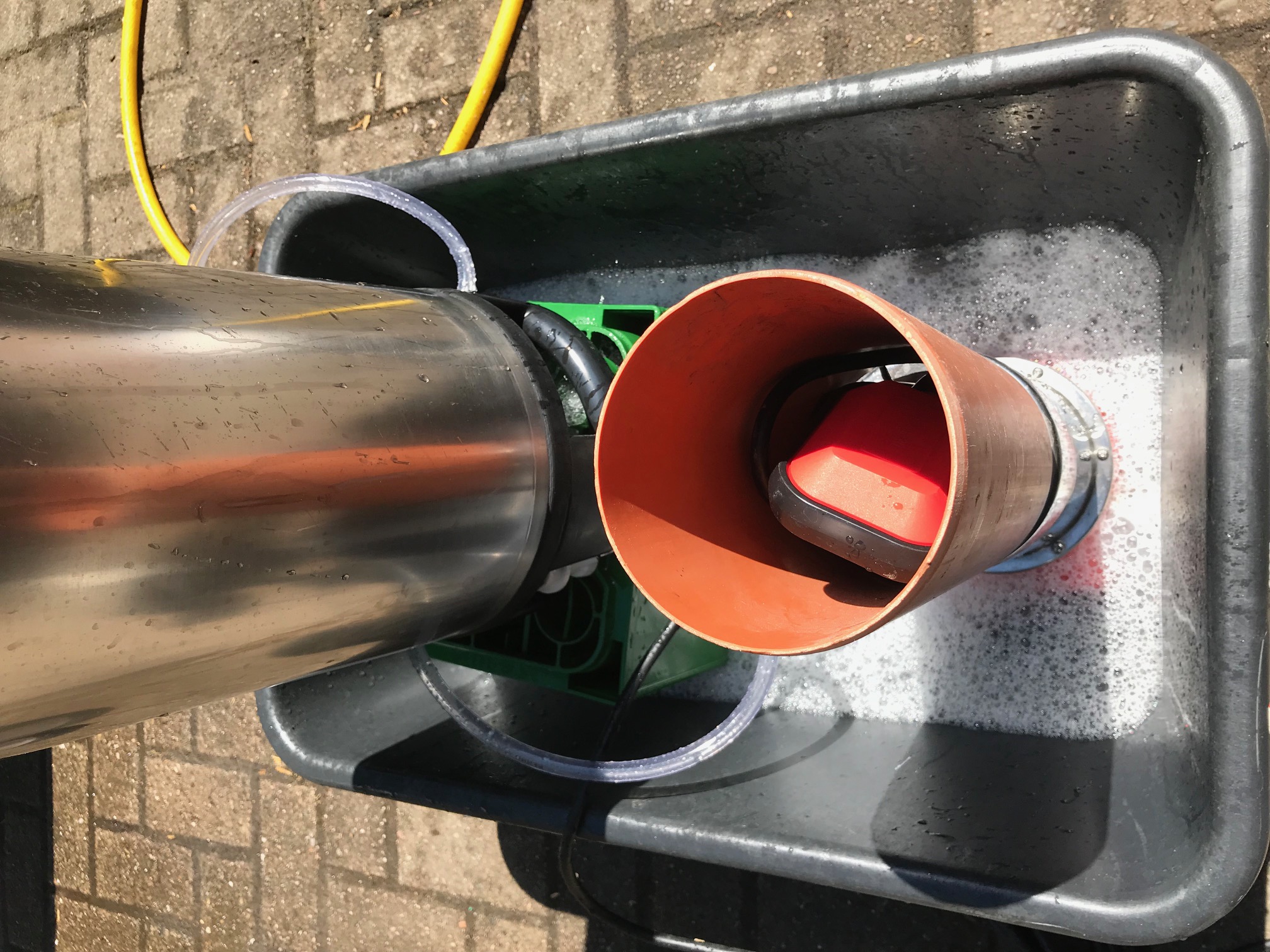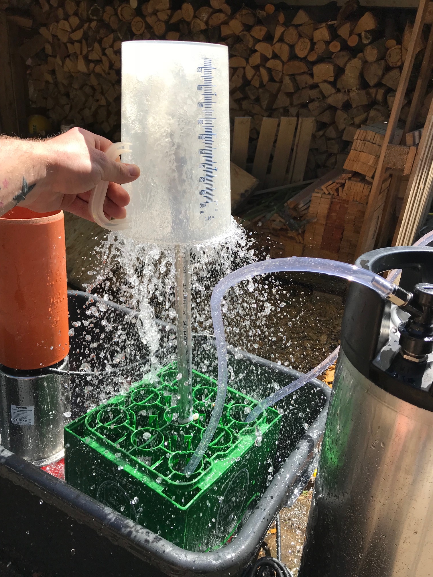 Hier zwei Bilder vom Waschvorgang, die Pumpe leistet extrem viel, es hört sich fast an wie ein Kärcher im inneren. Hier einmal der Einsatz ohne Keg, ich habe versucht in Deckung zu gehen... Die Betonung liegt auf versucht, im Umkreis von 10 m war alles pitsch nass innerhalb ein paar Sekunden. Auf dem Bild kommt es nicht richtig rüber aber nach abschalten der Pumpe kam 3 Sekunden später immer noch Wasser runter ;)